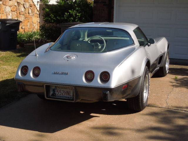 Slick, quick. 1978 Corvette. B2Z anniversary package - special paint, decals, sport mirrors. Oyster interior. The car is in well above average cosmetic condition - never repainted nor has the interior been reworked. It has a bit over 44K miles and has been garage kept. The car was delivered with: L-82 engine 4-speed Borg Warner transmission. 3.36 positraction Tilt/telescope steering column T-tops Air conditioning AM/FM stereo Lighting Package F-41 handling package Power steering Power Brakes Now the car has: 383 aluminum headed stroker - original to the car block MSD Atomic fuel injection on aluminum manifold Roller cam and lifters MSD electronic ignition and rev control Tremec 5-speed transmission, /.064 final drive ratio 4.11:1 rear gears positraction, heavy duty components H/D driveshaft, axles and trailing arms Twin disc ceramic clutch Aluminum radiator Twin electric fans Optima Battery Cal Custom valve covers w/matching fuel pump block off The car will also come with M/T drag radials mounted on 8" steel rally wheels 10 passes on tires. The updated drivetrain has less than 500 miles since it was professionally built by ASE Master Tech George Schmidt. This car is a blast. Has turned a 12.19 1/4 at Tulsa Raceway Park. Should be good for mid 11s, with a better driver than me. I am kind of a novice. Drives great, is fun, and is very streetable. A/C is operational. All original options are intact. Runs well on pump gas. The car has, as a bonus, a custom Kenwood audio system, built by Audio Advice here in Tulsa. Very nicely done, not a hack job. Incorporates bluetooth technology. Buyer arranges shipping or, more fun, just drive it home! Thanks for looking and considering your new home for this neat Corvette. |