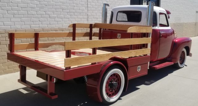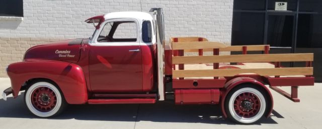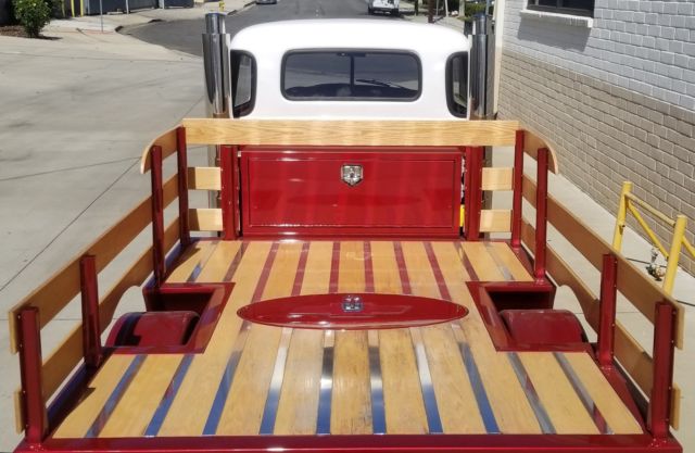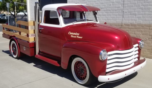 Reveled at SEMA 2016, only 400 miles since the build was completed. One of a kind 5-window custom staked pickup powered by a 6.7L Cummins Turbo Diesel with a Standard Transmission & Gear 5 speed transmission riding on a TCI chassis and Bulletproof suspension off of a 2015 Chevy 3500HD, 4 custom Wheel Smith 18" Billet Aluminum wheels wrapped in Diamondback ¼" whitewalls, the exterior is finished off with a custom Red & White PPG paint job and Bedwood & Parts custom bed and stake sides. Completed with a Katzkin red & beige leather interior, vintage Air, a Kenwood head unit, and 4 Speakers. The truck was found on a oil field in Texas, it was purchased and sent to California where a local hot rod shop took over 3 years to build. Not a single part of this truck was left untouched, lots of details and attention went into the build making it what you see today.