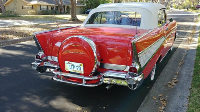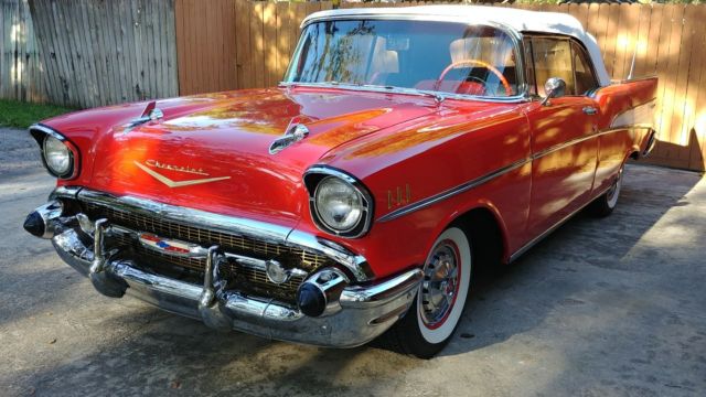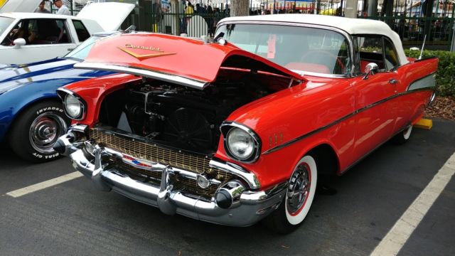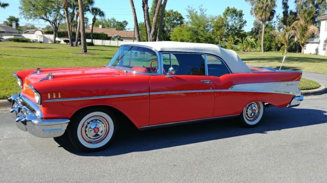 1957 Chevrolet Bel Air convertible. This frame off restored Bel Air is painted Red with white power top, with new Red and Black two tone interior. All of the restoration work has been professionally done to show quality. It's an awesome car with excellent paint, and it has all the updated options that make it more enjoyable to drive, including Ice Cold air conditioning. The options are: 1) 283 Power Pack V8 2) 350 Turbo 3 speed automatic transmission 3) (605) Power Steering conversion 4) Modern Power Brakes 5) Cruise Control 6) Air Conditioning 7) Under Hood Light 8) Power Windows 9) Power Seat 10)Stainless Steel Exhaust System 11)Continental Kit 12)Fender Skirts 13)Spinner Hub Caps 14)Auxillary Bumper Gaurds 15)Trunk Light 16)Rear Deck Lid Trim 17)Dual Rear Antennas 18)Back Up Lights 19)Power Door Locks 20)Coker Wide White Wall Radial Tires. 21)AM/FM Radio Ready for a Car Show, Parade, or just a nice Sunday drive. No trailer needed, you can drive this car anywhere. Call Ron at 573-701-3844 for more info. I am not a dealer. The title is in hand and ready to be reassigned to the buyer. |