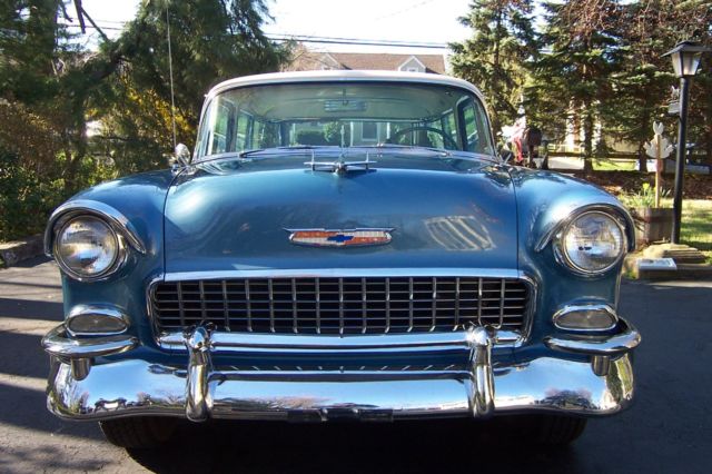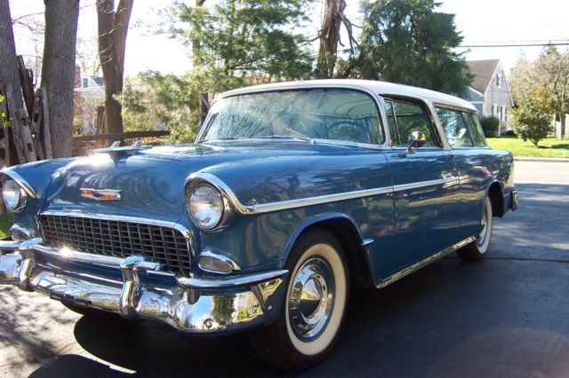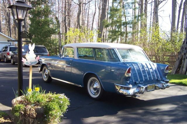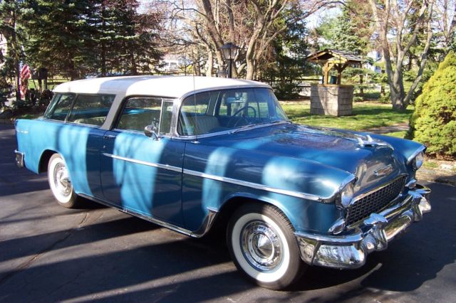 Beautiful 1955 ChevroletNomad....69,000 miles.....1 re-paint inits original Glacier Blue Metallic with it's creamy white roof.......No rust...Original 265 and 2 speed automatic have been rebuilt.......Original rear rebuilt.........Original interior....For safety, a front disc-brake kit was added as was a dual master cylinder.....However, every original piece has beenretained.....The paperwork included with this car is incredible.......It's origins have itbeing ownedby a florist in New York City ......Selling for a friend so, please contact Mike in New Jersey for any particulars....732-872-6373