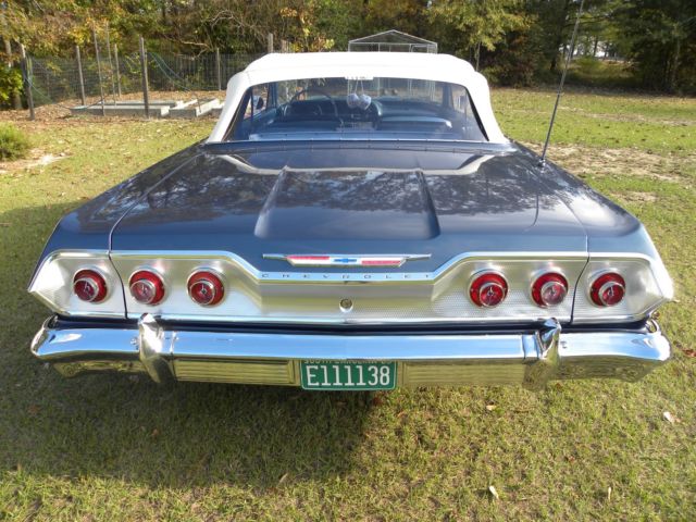 1963 Impala SS Convertible. A real SS car. 327/300HP W/700/R4 Transmission and RARE Factory A/C. (Original excellent 4SP trans, pedal, etc included) Power options are PS, PB (disc on front) Glove Box trunk release and Windshield washer. Tilt Wheel. Updated AF/FM Radio w/Sat and Ipod connections. (original working AM/FM radio included) Power top is new as well as top mechanism and fresh carpet. Great sounding new Smitty muffler system. 215/75/R14 tires on original wheels and caps. This is a terrific rare road cruiser and show car that wins at car shows and gets you there with no issues. Turns heads and sparks much conversation. Serious inquiries received at email criminv45@gmail.com. Priced below $64,000 market at $55,950.00. If your wondering, NO, there is nothing wrong with the car. I just need to sell it due to pressing matters. Subject to prior sale as advertised in other markets. Vehicle in Elgin, SC