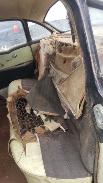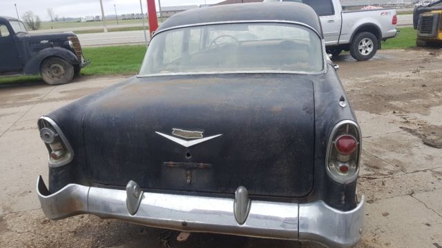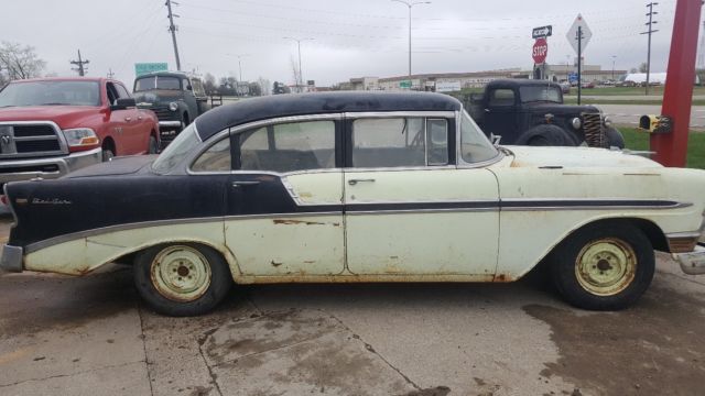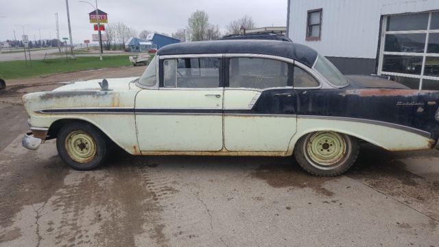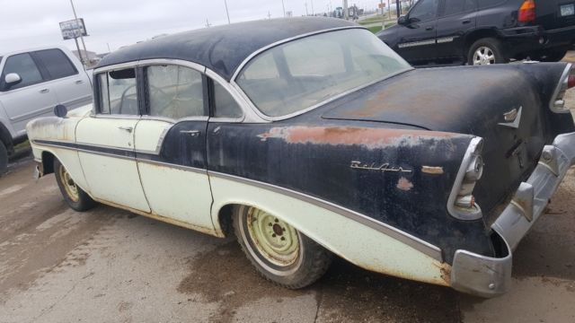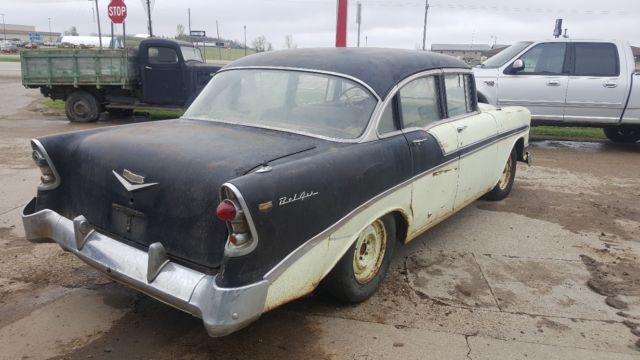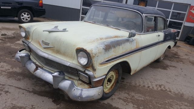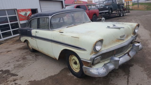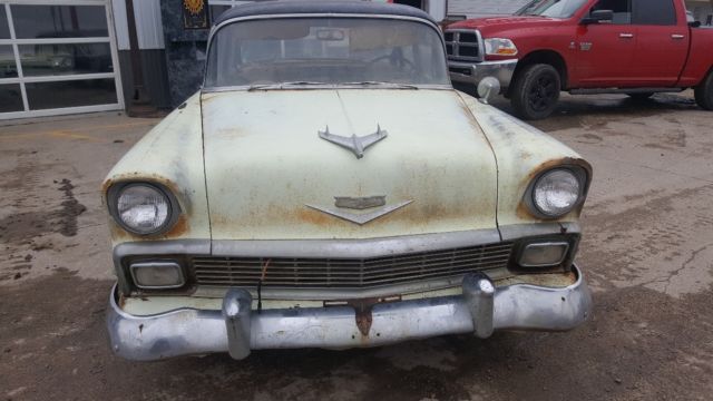 | THIS 1956 CHEVROLET 4 DOOR COMES FROM A LONG TIME STORAGE IN WESTERN NORTH DAKOTA.IT HAS THE ORIGINAL V-8 MOTOR;IT HAS THE AUTOMATIC TRANNY;THIS IS A VERY GOOD CAR TO RESTORE;THE FLOORS ARE ALL HARD; ONLY SURFACE RUST;THERE IS CRACKED GLASS;I COULD NOT TURN THE MOTOR BY HAN, SO IT COULD BE STUCK;THIS CAR WILL NEED TOTAL RESTORATION.CHECK OUT THE PIX'S;I AM SELLING AS IS WITH NO WARRANTY;I CAN HELP ARRANGE REASONABLE SHIPPING;JEFF 218-464-2821 |