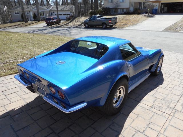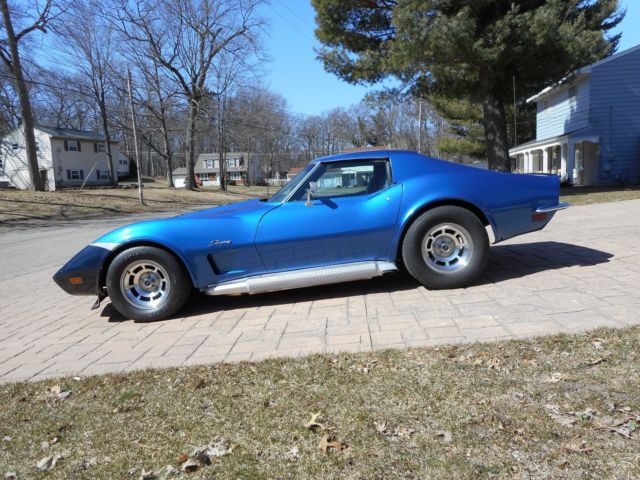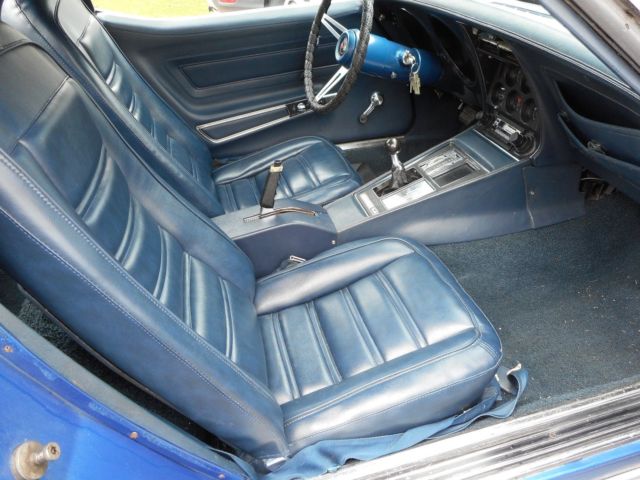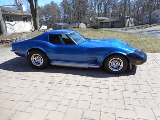 Matching numbers 1973 Corvette. L-82 engine, 4-peed, positraction. Rare combination. This is an early car. One of the rare factory 1972 left over engines. I have a magazine article on this. Tilt/telescoping wheel, t-tops, removable rear window conversion, like 1972 and older. Interior redone. Headers, functional sidepipes, edelbrock manifold. Includes original manifold & rams horns. Adjustable fibreglass rear spring and camber rods, offset trailing arms for wide tires. The engine was professionally redone at 65,000 miles to stock specs. Paint is older candy blue metallic, but keyed on the rear deck. The frame is patched at the kickups. Some rust on the drivers door frame and radiator support. Great car to restore.On May-13-18 at 14:22:24 PDT, seller added the following information: