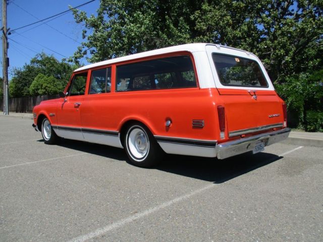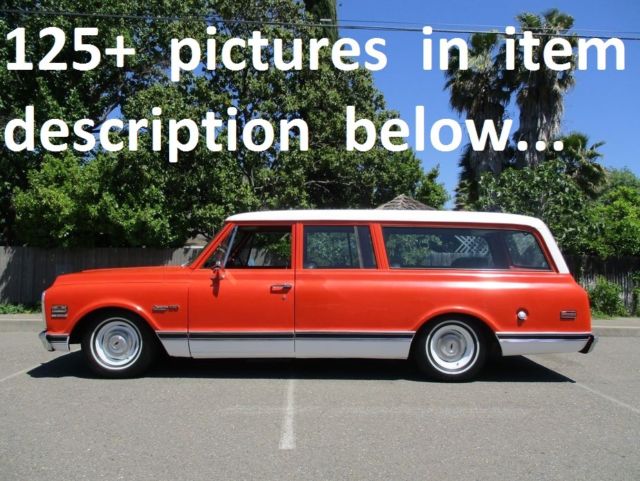 RARE '72 CHEVROLET SUBURBAN STARTING @ $1972 WITH NO RESERVE. Very complete, original Chevy Suburban. Hugger Orange on Black interior. All 3 original seats. Factory clamshell, tailgate model. Factory front & rear Air Conditioning. Factory Power Steering. Factory Power Brakes. Factory 350 V8 with original smog emissions still intact. Factory 350 Automatic. Original SPID options list on the inside glove box. Original owners manual, factory jack & spare tire. Full 5 lug, 1/2 ton suspension. 6&8x15 steel wheels with new 235/75r15 white walls and derby caps. Professionally lowered with CPP components: - dropped spindles, 2" springs, short shocks up front - 4" springs, 2" blocks, short shocks, adjustable pan hard bar, welded in mini C-notch rear Ride is excellent, uncompromised & no bottoming out. Truck largely sat for the last few decades and has been resurrected over the last2years into a road worthy, patina hotrod/shop truck levelexample. Not without some rust, but all in all,very sound/solid. Well worthy of a full restoration, but super fun/enjoyable as-is. Runs, shifts, stops, starts, steers and drives nicely. Geared for freeway driving. Dual exhaust. Sounds great, nice & rumbly, but not tooloud or obnoxious. Most everything works: horn, wipers, headlights, high/low beams, turn signals, brake lights, locks, fuel gauge, amp gauge, oil pressure gauge, speedometer, dome light and parking brake. A/C and heater unit are 100% complete and in tact, however will need some servicing. Temp gauge is also nonop however motor runs cool, and has been repeatedly checked with a temp gun. Runs in the 165-180 range fully warmed up. Odometer reads 73,019 however actual miles are unknown. Absolutely awesome, rare, classic wagon. Crowd favorite everywhere it's been. Pre-purchase inspections welcomed & encouraged anytime prior to auction ending. DRD Motor Trade is a licensed, bonded Ca dealer. Sales tax & fees due at time or purchase only to buyers taking delivery in California. Link to youtube video here: https://youtu.be/4AsDRwYCt2c 125+ pictures below, enjoy. |