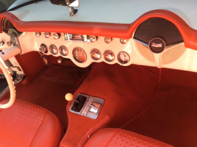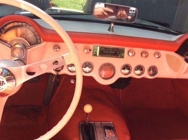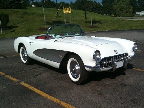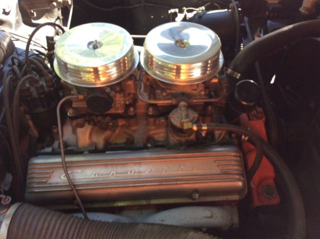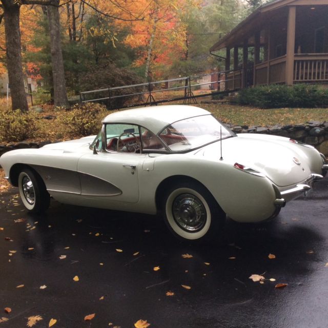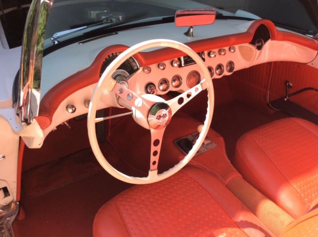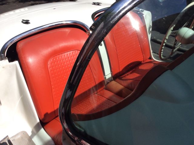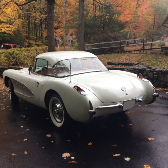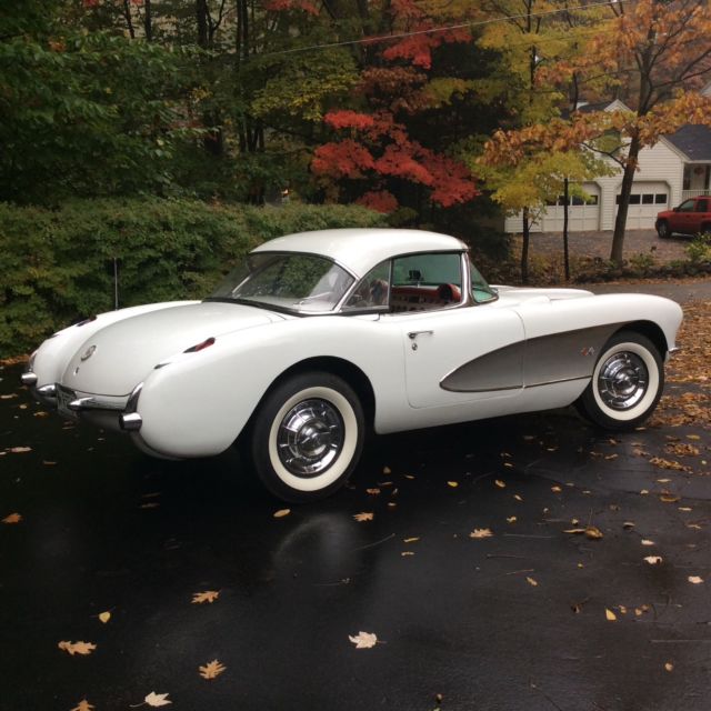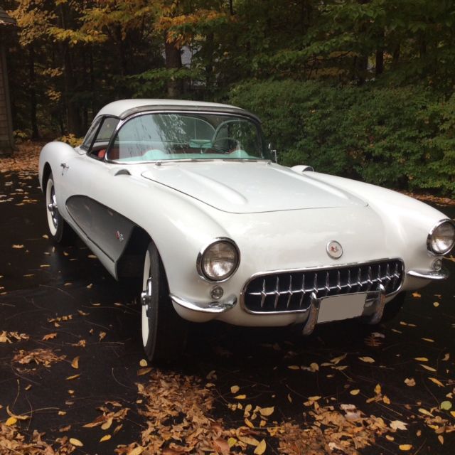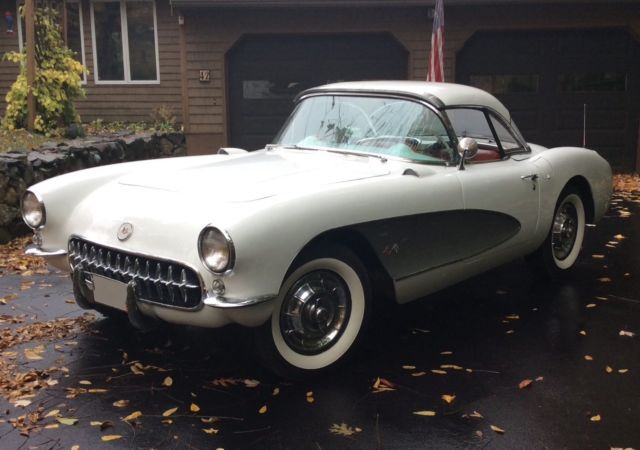This 1957 Chevrolet Corvette is a clean example powered by its original 283ci V8. The previous owner removed the factory 3-speed transmission in favor of the optional 4-speed unit.Cosmetics are in good driver condition with an older Polo White repaint still looking shiny with silver coves, and the Venetian Red interior holding up well. The car is sold with the original 3-speed transmission and linkage, factory hardtop, Wonderbar radio, and a clean title. The car was repainted to match the original Polo White (718) with Silver coves (704) by the previous owner and presents well overall. The fiberglass body panels look straight with no major dents or dings visible. The chrome brightwork is in good condition and shows below normal wear for its age. Some light scratches are visible in various places, and some of the teeth in the grille appear slightly dull. The glass is free of cracks and any significant nicks, and all of the lights are working properly. The 1957 Corvette came equipped with independent suspension up front with unequal length A-arms and coil springs, while the rear suspension was a live axle setup on semi-elliptical leaf springs. Anti-roll bars were found on both the front and rear, and all four corners had hydraulic shocks and 11'' drum brakes. The stock 15'' chrome hubcaps and knock offs are in good shape and wear 4-ply polyester wide whitewall tires. An optional hardtop was available in 1957 and is included in the sale. The headliner appears clean with no tears in the fabric. The soft top is in good condition and tucks behind the seats and underneath the integrated rear hatch. The Venetian Red interior provides a nice contrast against the white body and is largely original. The steering wheel shows some wear and has a few scratches, but the remaining white painted surfaces on the dash and door panels looks good. The seats have resisted any significant UV damage and have no tears or rips, though some wear and light staining is evident. The carpet on the transmission tunnel has faded over time, while the rest of the carpet has fared better with no discoloration. The chrome trim around the seats and on the door panels has some normal wear and light scratches, but looks bright overall with no dents. The speedo and tach need to be rebuilt, and the other gauges are working properly. The Wonderbar radio was replaced with a more modern AM/FM unit, though it is included. The chrome instrument bezels, dash trim, and rear view mirror are in good condition, but the chrome piece surrounding the speedometer and extending down to the steering column shows significant pitting. The original 283ci V8 (469A) features dual 4bbl Carter carbs and distributes power through a 4-speed manual gearbox. There were 2,045 Corvettes built with this engine in 1957, out of a total of 6,339 total built for that MY. The motor was advertised at producing 245 hp and 300 lb.ft of torque when new. The original 3-speed transmission and linkage are included and were reportedly rebuilt.