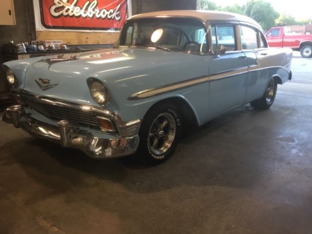Very solid 1956 Bel Air 4 door.Under carriage is very good and frame is solid.Small amount of rust coming through paint on rockers. Rear Qtrs. appear to have been replaced. 350 SBC with NEW Edelbrock electric choke carb. Edelbrock aluminum intake. HEI distributor.New 160 degree thermostat installed. Could use a bigger radiator.Motor runs very good. Just drove approx. 50 miles today 7/3/18 with no issues.4 spd transmission. Shifts well into all 4 gears and reverse.American Racing Torq Thrust rims with 275/60/15 rear and 235/60/15 front tires. This Bel Air runs and drives well and stops well. It is not a hot rod but a good solid cruiser.Paint is driver quality with a few chips and issues.Interior was replaced in 2015 and in very clean and good condition. Good solid driver you can enjoy or take to the next level. $500 deposit. Balance due in 7 days. Must be picked up in 30 days. |