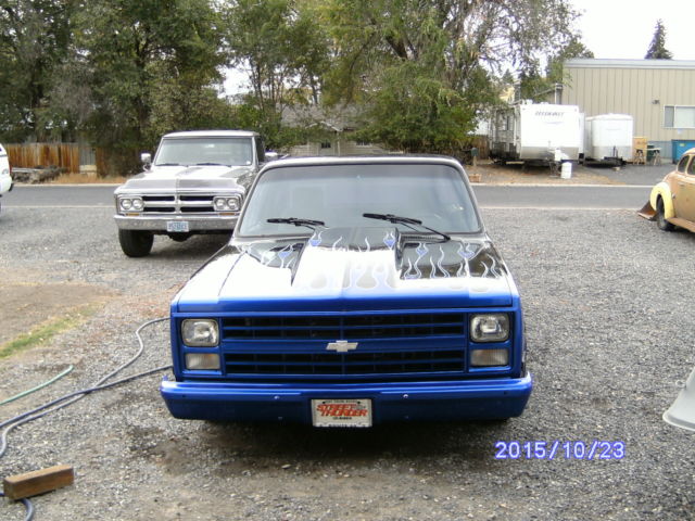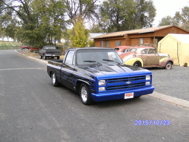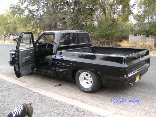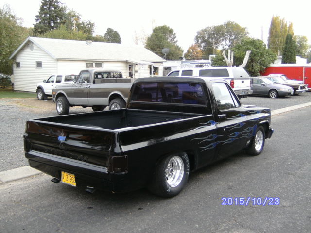1985 Chevrolet C/10 S.W.B. Classified as a Turn-Key Pro Street, Street Rod, Drag Truck that runs very well 600-hp-Plus Big Block. 468 CID. Built for 1/8 mile. Hooker competition headers with 3" exhaust and Flow Masters all the way out the back. Headers can be uncapped. Holley 850 double pumper. Electric fuel pump.(frame mounted). Billit aluminium pullies. K&N air filter. Crower roller rockers. Very healthy Crane cam. Northern aluminium radiator with dual electric fans. Turbo TH-400 with a Manual Shift Valve body. Safety loop on the drive line. B&M ratchet shifter. 10-Bolt with a 4:56 Detroit Locker. This Truck is not all hacked-up. (has not been tubbed). Hoosier quick time 325-50-15's on the rear. 215-60-15's on the front. Weld pro star wheels. It has been C-Notched in the rear plus has Drop Spindles on the front. Has a Custom Paint job as well (not perfect but pretty nice) Clear starting to peel in a couple of places. Does not have any rust at all. Roll pan in back, shaved steak pockets,drip rails. Fiberglass hood. Has been VIN checked.( All clear). Brand new Carpet and Dash mat. Way too many things have been done to list everything. This is one of the baddest street rods around. I have owned this truck for about four years now. Its just time to move on. Very fun and ready to go racing or just cruizin. Clear title in hand. This is a must see Classic Truck. This vehicle is for sale locally so I reserve the right to end auction early. Any questions call Dan @ 541-815-2089. Thanks for looking. Enjoy the bidding.