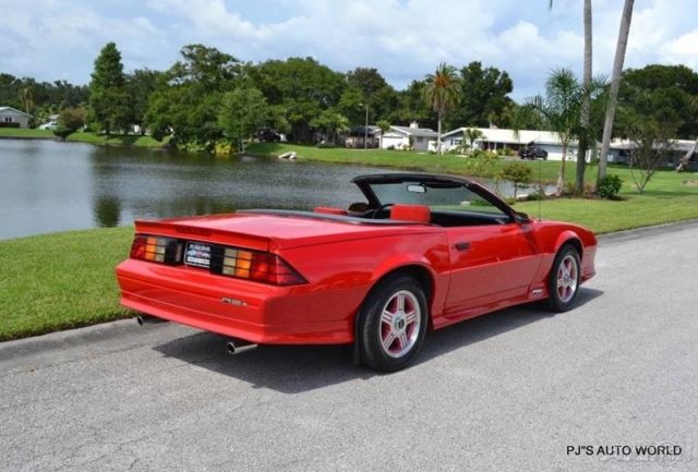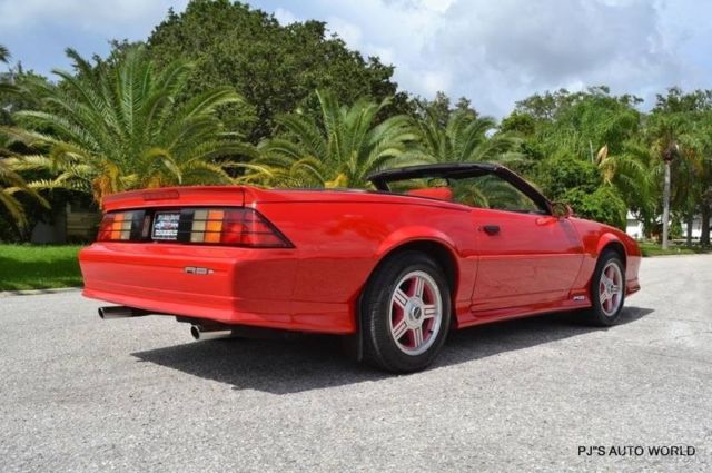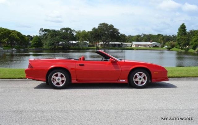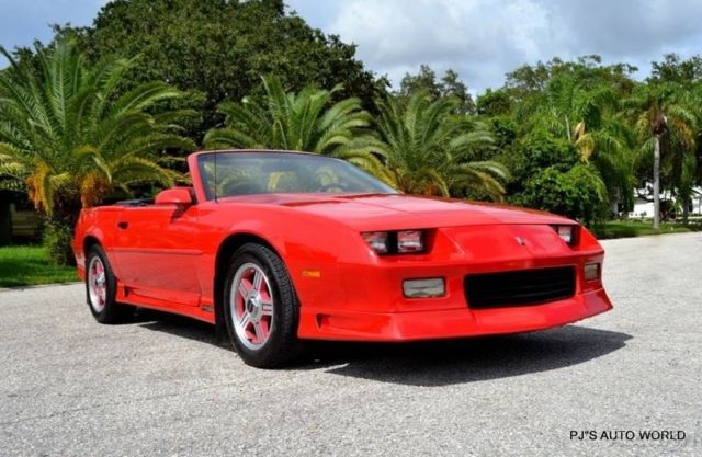 1991 Chevrolet Camaro RS Convertible For Sale ( 1 owner car with 42,689 miles). 5.0L V8 engine, automatic transmission, A/C, power steering, front power disc brakes, 16"Â 5 spoke alloy wheels, bright red exterior, ground effects package, rear deck spoiler, canvas convertible top, color keyed mirrors, red cloth bucket seat interior, fold down rear seat, tilt steering column, power windows, Delco AM/FM/Cassette radio. You just don't find third generation Camaros in this condition. Clean and beautiful call us for more details on this very special car. Price $14,900