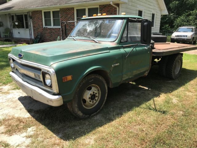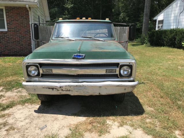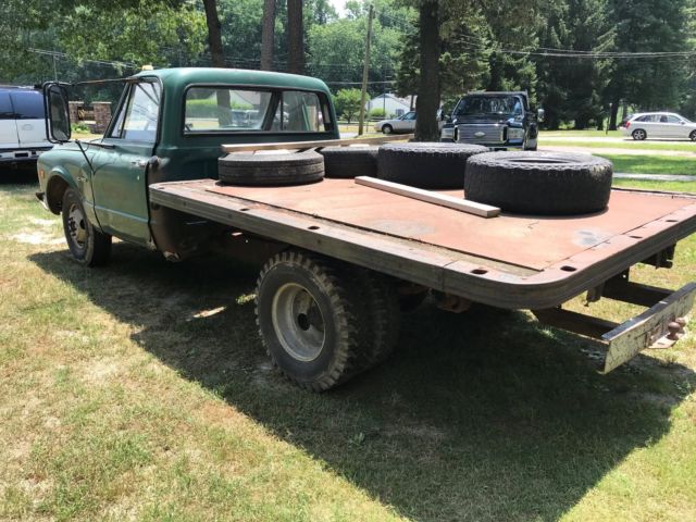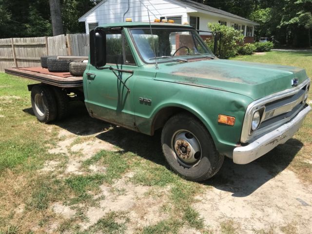 Up for sale is a 1969 C-30 dual rear wheel two wheel drive 6cyl 4 speed. It does run and drive but needs a tune up and the breaks are spongy. I purchased it a couple of months ago with the intensions of doing a complete restomod. I do not have the time right not to do any projects. The cab corners rocker panels and floor needs to be replaced. Also has some rust on frame. Factory options were flat bed, auxiliary springs, oil gauge, green vinyl trim, w/coast mirror, heavy duty front spring, Dual rear wheel conversion, Dark green Paint.
