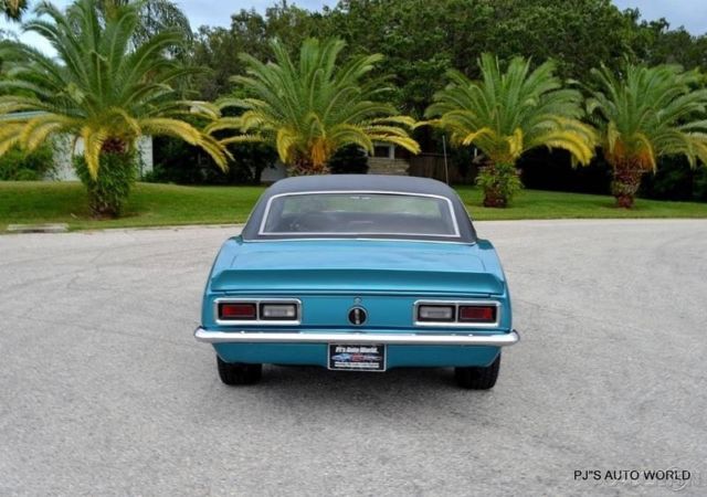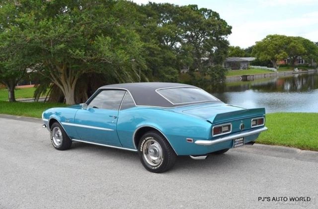 1968 Chevrolet Camaro For Sale. 327 cubic inch V8 engine, Muncie 4 speed manual transmission, chrome engine dress up package, Holley 4 barrel carburetor, headers, dual exhaust, 14"Â Rally wheels radial white letter tires, re finished in its original color Tripoli turquoise with a white stripe package, super sport hood, black vinyl top, rear deck spoiler, chrome sport mirrors, black bucket seat interior, center console with Hurst shifter, AM/FM radio with auxiliary input, day night interior mirror. Great looking and fun to drive, this legendary GM sports car is ready for its new home!!! Price $32,900 Automotive History: The first-generation Chevrolet Camaro appeared in Chevrolet dealerships in September 1966 for the 1967 model year on a brand-new rear-wheel drive GM F-body platform and was available as a 2-door, 2+2 seat, hardtop (no B or center pillar) or convertible, with the choice of either a straight-six or V8 engine. The first-generation Camaro was built through the 1969 model year. The styling of the 1968 Camaro was very similar to the 1967 design. With the introduction of Astro Ventilation, a fresh-air-inlet system, the side vent windows were deleted. Side marker lights were added on the front and rear fenders which was a government requirement for all 1968 vehicles. It also had a more pointed front grille and divided rear taillights Four distinct generations of the Camaro were developed before production ended in 2002. The nameplate was revived on a concept car that evolved into the fifth-generation Camaro. The first-generation Camaro lasted until the 1969 model year and eventually inspired the design of the new retro fifth-generation Camaro. production started on March 16, 2009 and on May 16, 2015, Chevrolet introduced the sixth generation Camaro at Belle Isle park in Detroit, Michigan. The launch, complete with previous generation Camaros on display, coincided with the vehicle's upcoming 50th birthday.
