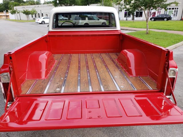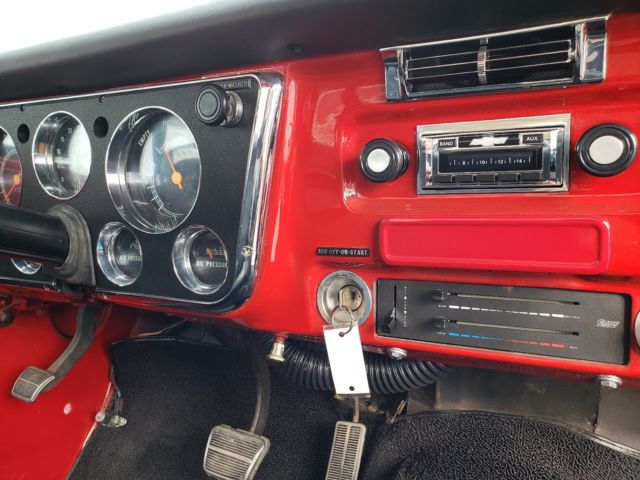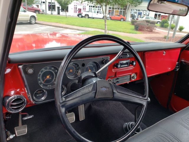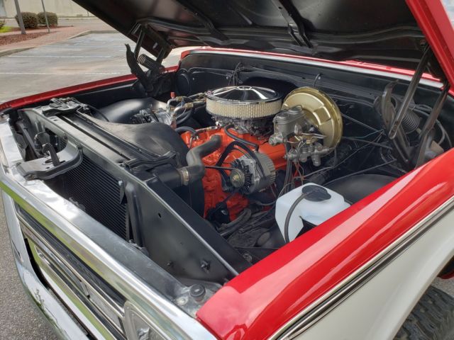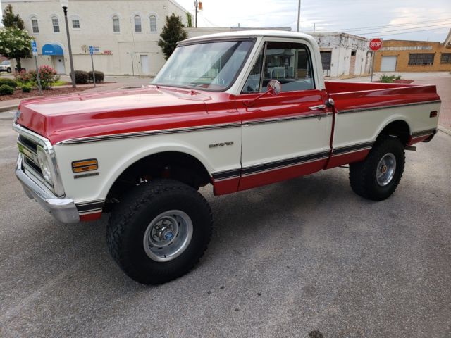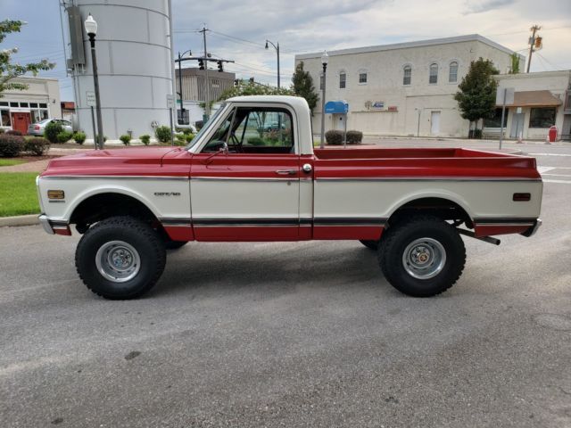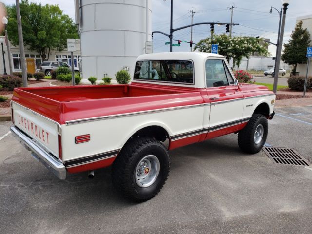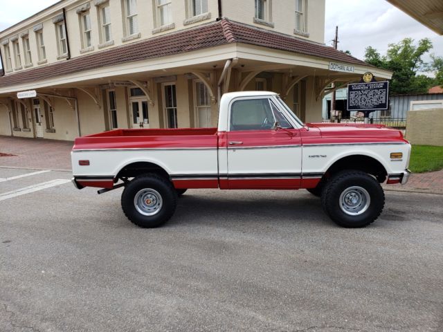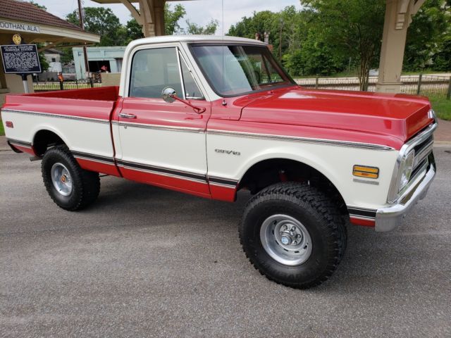 Great looking Chevy K-10 short bed fleetside just the right color. Has fresh Red&White paint with all new body side mldgs,grille,bumpers,mirrors, and emblems.Bed has new oak floor with stainless strips looks great. Tailgate is also new. Has new carpet, correct seat cover on a excellent seat cushion and frame.Original black steering wheel looks great with factory tach and gauges. Has new dash pad, Custom Auto Sound radio and speaker. Just installed new Classic Auto Air kit with the factory dash outlets. New style blows hard and cold. Has all new glass and weaherstripping. Engine compartment has been detailed as has correct fresh 350 engine with all new seals and gasket.New high torque starter and flywheel installed Sounds like late model starting Has new edelbrock carb and new exhaust with turbo mufflers Has a great sound but not loud. Trans shifts out great Has a 2 1/2inch Rancho suspension lift with Rancho shocks and stabilizer. Rides on 33x12-50x15 Cooper tires on 15x8 ralleys. Nice straight body makes this 70 Chevy 4x4 a real eye catcher For more info call 334-718-4639 Steve