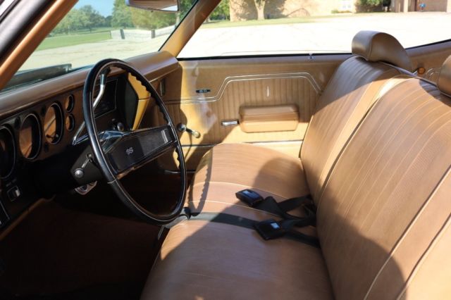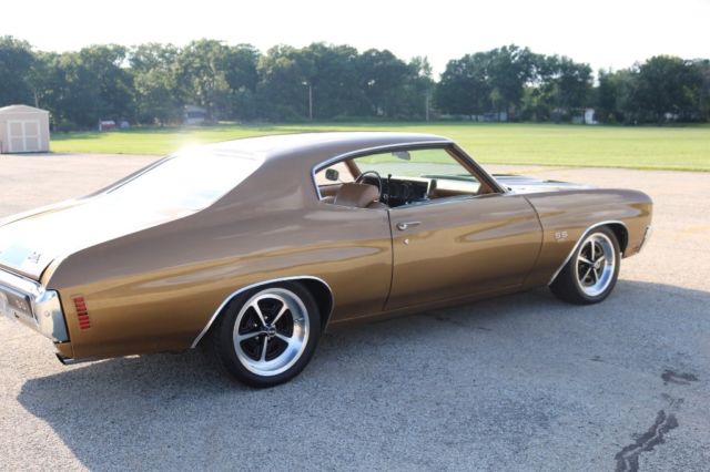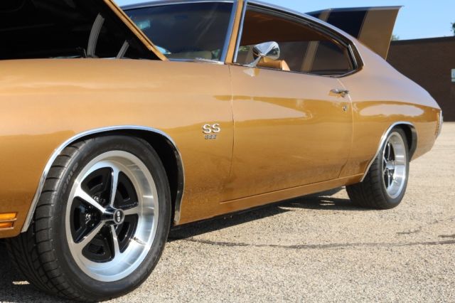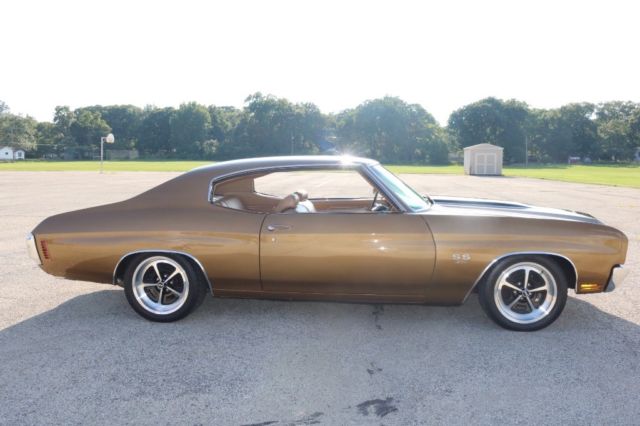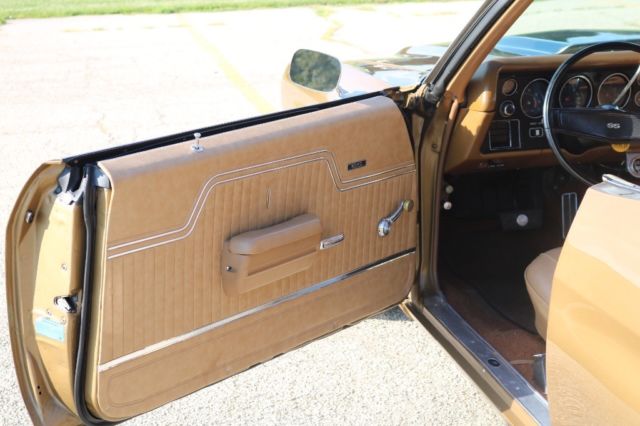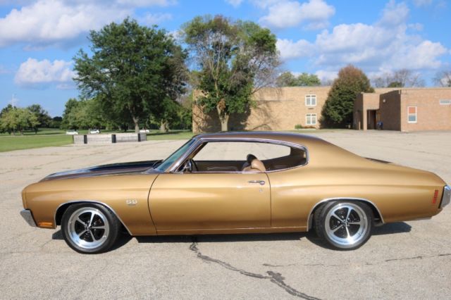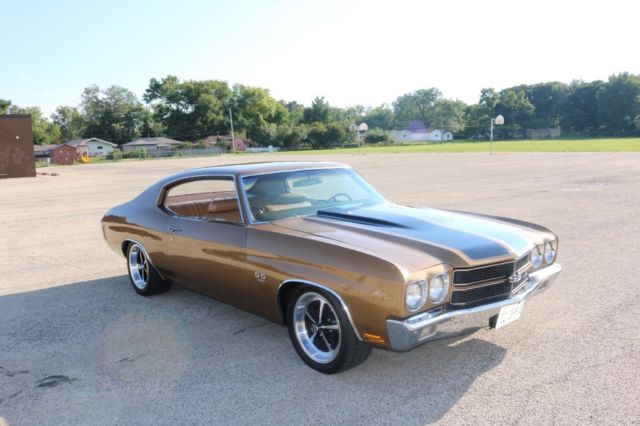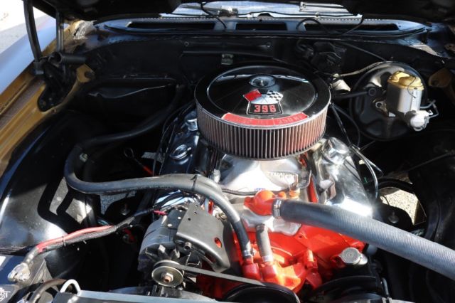Matching Numbers 396 CI Big BlockTurbo 400 Automatic TransmissionOriginal Build SheetOwners ManualPower Steering10 Bolt Rear EndAll Restoration ReceiptsCorrect Dark Gold Color CombinationBlack Racing Stripes/Saddle InteriorOriginal 14" Magnum Rims and Factory Stereo 2016 Updates by Custom Classics Include:Engine Rebuilt, Ceramic Coated Headers3" Inch ExhaustAluminum IntakeHolley 650 Quick Flow CarburetorStage I Suspension KitSteering BoxFront to Rear 1/4 Return LineFront to Rear 3/8 Fuel LineBrake Line Front to RearRear Acel Brake LinesSteering BoxNitto 17â€X8 Magnum Wheel QTY2Nitto 17â€X9 Magnum Wheel QTY2New Door & Side PanelsGriffin Direct Fit Radiator Combo2 Rear and 2 Front SpeakersCustom Sized New Radio Bluetooth Capabilities I purchased this Chevelle SS in October 2015 at Mecum Auction. The vehicle spent most of 2016 being upgraded by Custom Classics. I have over 25K in repairs and upgrades to improve drivability and reliability but maintained the muscle car performance. I have included a picture of the original build sheet. The car is in excellent running condition. The body is in great condition. The unique color combination and big block sound makes this vehicle a standout muscle car. All receipts available of work performed to upgrade the vehicle.