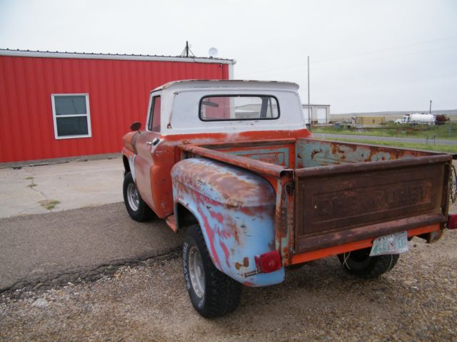 1966 Chevy C-10 4x4 Pickup short bed, was originally a 6 cylinder, now has a small block V8, was told it was a 327 but I am unsure about that. It has a THM 350 transmission that is in good working order, the 4 wheel drive works well. It will need a tune up but will drive on and off a trailer just fine. I drive it around my shop regularly. The only rust is a small amount on the inner rockers. There is a piece cut out of the bottom right fender, this was to get to the bolt on the underside of the fender(see pictures). This is a very solid truck that could be restored or made into a daily driver. The wires to the tail lights have been cut off and the blinker switch is bad, so it will need to be rewired or a new harness. It is not in road condition but will not take much to get it there. For more information, call Casey at (806) 395-9686. Please ask any questions you have before bidding. Thank you for looking!