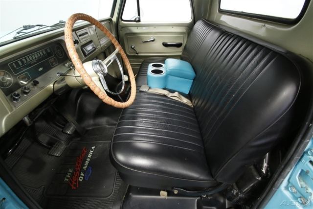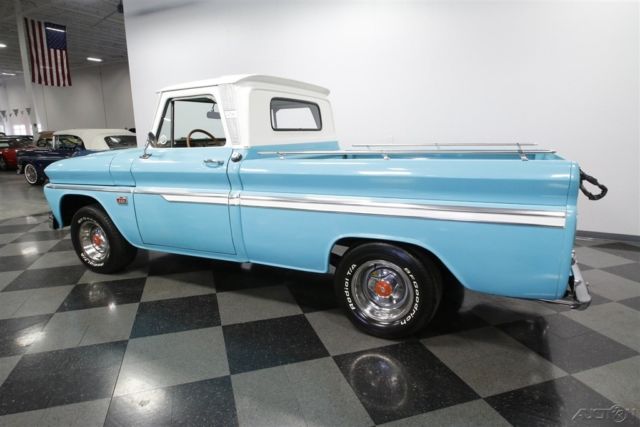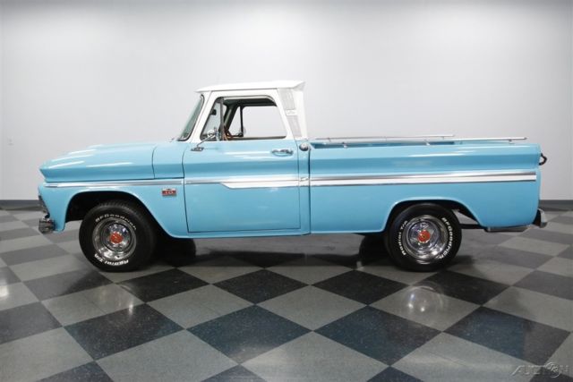You can't go wrong with a handsome older pickup in traditional colors, but this 1966 Chevrolet C10 Custom Cab is actually a wolf in sheep's clothing. The lovely two-tone paint is low-key, but the upgraded V8 and four-speed adds bark and bite to this shiny Chevy. A clean old pickup in classic colors and wearing a fleetside bed always makes for an appealing package. The two-tone light blue with white accents is just perfect on a vehicle from the mid-60s. The finish shines beautifully, and they kept the wonderful details that make these trucks special. The big chrome bumpers, wide grille, and all the intricate trim â€" including full-length side accents and Custom Cab pillars â€" are terrific correct pieces. Plus, there are nice subtle upgrades like the bed rails, blue-dot taillights, and polished factory wheel covers with Rally-style trim. It gives this pickup as much appeal as a '66 Impala â€" and that sedan doesn't come with a gorgeous real wood truck bed! Inside is a nice mix of vintage and new. The door panels, dash, and bench seat look complete and correct. But now you also have great upgrades for comfortable cruising like the AM/FM/CD stereo and the removable cup holder center arm rest. This classic Chevy pickup even has a sunroof! The vintage dual-spoke steering wheel gives you a terrific view of the factory gauges. As you spot the large tach, auxiliary gauge trio, and floor shifter, this classic pickup also gives your senses the tingle of performance. Under the hood is what makes this pickup the complete cool package. You get the show-off shine of the valve covers and air cleaner, but beneath that is some real power. The 350 cubic-inch V8 has all the right upgrades, including a four-barrel carburetor, K&N air filter, and MSD ignition. Plus, the headers add even more power as they also contribute to the rumble of the glasspack-style. It's a powerful V8 that you get complete control over the speed and the sound thanks to the Muncie four-speed manual. But more than just a pure power pickup, it truly is an easy cruiser thanks to features like power steering, front disc brakes, and the C10's trailing arm rear suspension. A cool exterior, a custom interior, and a growling V8 is why you were attracted to this Chevrolet C10 pickup. But the same great custom features attracted others, too, so you may want to hurry up and call today!