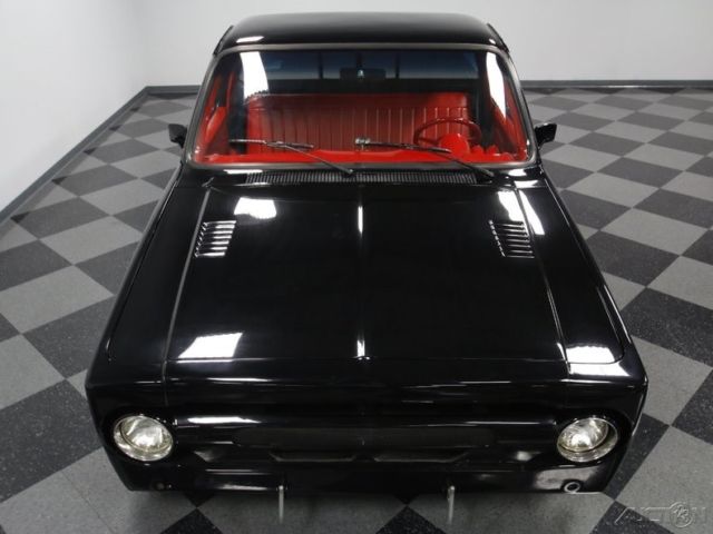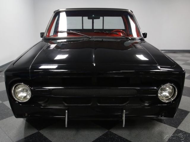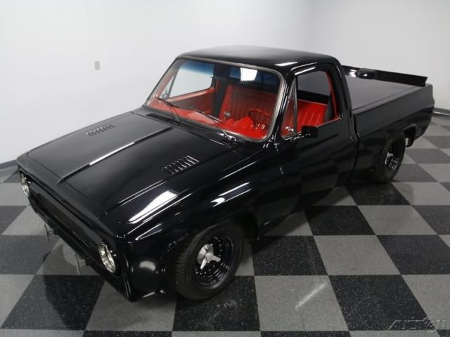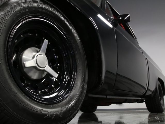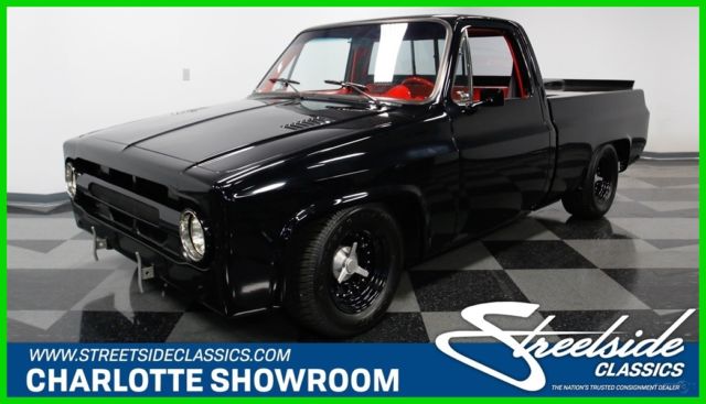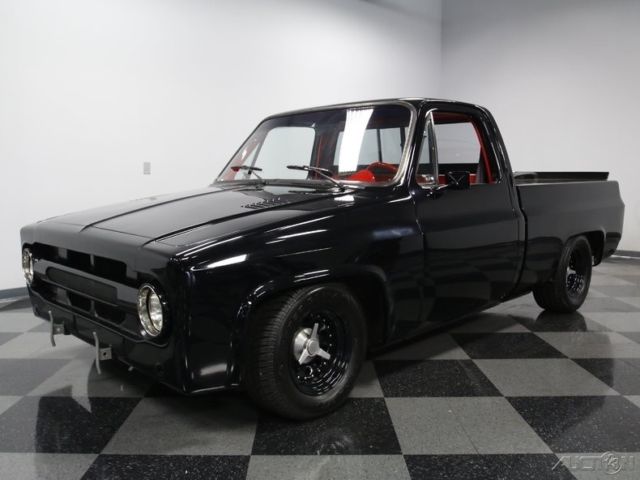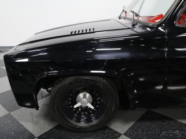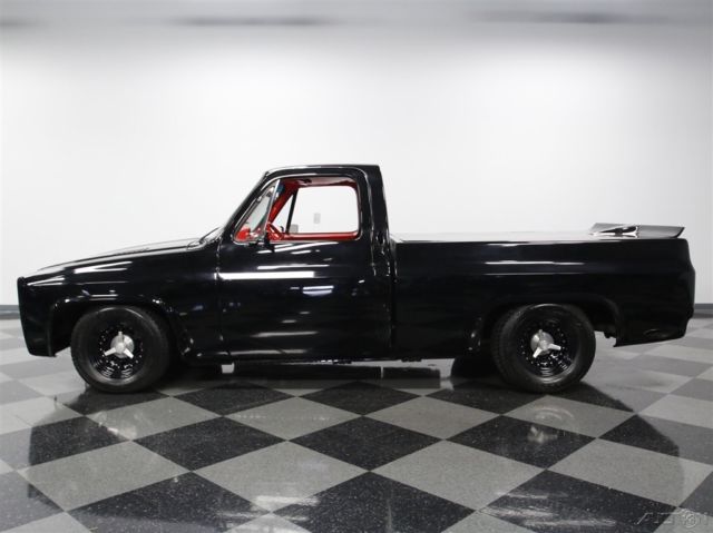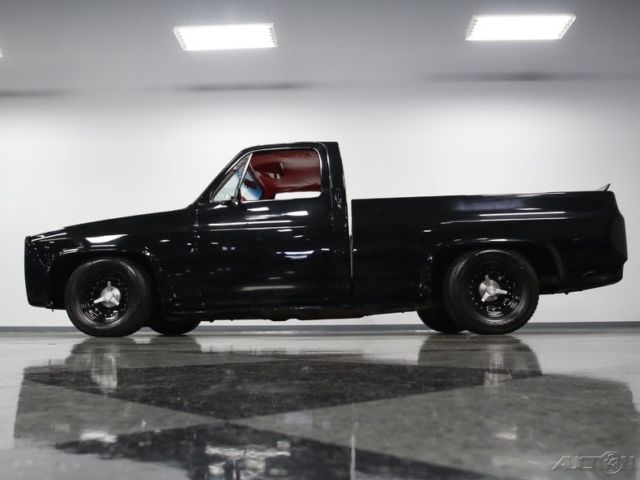 With hints of mean machine, retro, ride, and a whole lot of custom, this 1986 Chevrolet C10 is that pickup for someone who wants people talking about your truck long after you leave the cruise-in. This custom pickup is striking from every angle, so we'll just start at the front. The fascia has a great retro and custom tone thanks to the blacked-out appearance that gives way to those bright round headlights. And when you combine it with those push-style bumper forks, it looks ready for the racetrack. As you move along the body, your eyes are constantly picking up on custom elements like the hood vents, shaved door handles, custom taillights, smooth tailgate and the custom tonneau cover with integrated spoiler and their brake light. There's even liner paint in the bed in case you do decide to use this for true pickup duty! But more than just recognizing the custom pieces, you should also appreciate the reason why you can see them so well. Super-straight sheetmetal combined with the level of gloss and shine on the black gives this one instant respect. In fact, the detail work is so good, just check out the wheels more than just steelies with cool spinner caps, those 15-inch Super Soft 8 units have bright rivet work that makes sure this one can impress no matter if they're across the parking lot or one-inch away. There's nothing better on a black exterior than a red interior. When you open the door, the contrast between the outside paint and the vinyl on the seats is like looking at a vampire after a fresh kill. That description might seem like an exaggeration, but it's necessary to try and describe the aggression this pickup radiates just by standing next to it. But the means looks are just the beginning. The red is part of a custom coordinated attitude that you instantly see the moment you take a look at the dash. This custom unit has a design borrowed from the 1959 Chevrolet. It even has the cool pod-style gauges. But the '50s Chevys didn't come with all these updates, like a large tach below the tilt column, cup holders, heat/defrost sliders, a grippy three-spoke steering wheel in a matching red, and a Schlitz beer tap handle shifter. It's a truly thoughtful build, right down to the AM/FM cassette stereo integrated into the headliner so that the dash can be as smooth and clutter-free as possible. Under the hood the red and black attitude continues as the painted valve covers look like they are radiating power from within the dark engine bay. And backing up this aggressive appearance is a strong Chevy 350 cubic-inch V8 that's been enhanced with go-fast goodies like a Holley four-barrel carburetor, Edelbrock intake, and long tube headers. That last one not only adds power, but also contributes to the rumble of the glasspack-style dual exhaust. And while this is a mean machine for the streets, there's much more to this custom pickup. It has a power steering, a thick front sway bar, front disc brakes, and four-speed automatic transmission w/highway-friendly overdrive. So the custom that you'll love showing off also easy to take near or far... that sound like the perfect combo! It's hard not to get excited about a full custom setup that's turnkey ready right now. But if you want to hit the streets tomorrow, you need to call today!