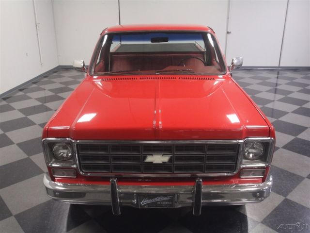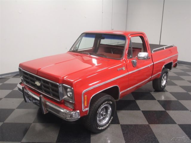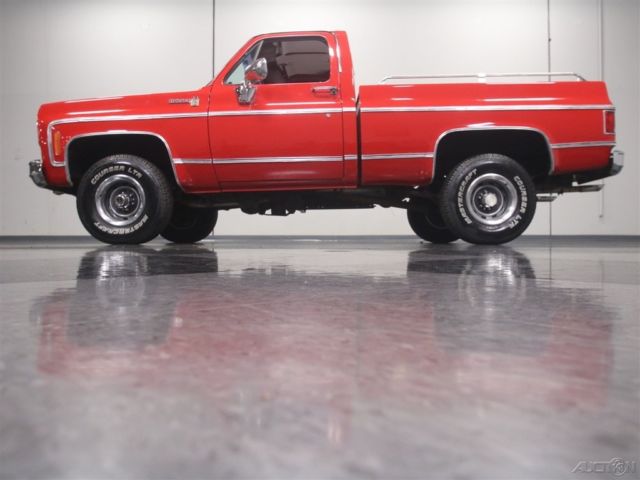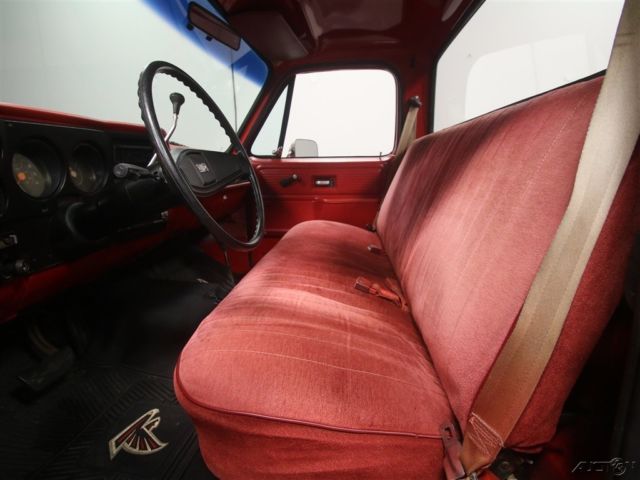 If you grew up during the '70s, you'll be relieved to know that Chevy trucks are finally getting their due for something that we've always known: they're just flat-out cool. Basic and rugged, sure, but also handsome in a leathery, hardened kind of way that is all business. Dressing them up with beautiful paint and a potent V8 sure helps, and in the case of this short bed/regular cab 1977 Chevrolet Scottsdale 4x4, it shows that there's just no way to build an unattractive one. They ALWAYS look good. At first glance, this might just look like another nicely preserved Chevy C/K-series pickup. But get a little closer and you'll discover that the bright finish is quite nicely done with a deep shine that looks great on this vintage pickup. And if you're going to look that closely, you need to nail down the bodywork, so this one is arrow-straight and doesn't look like it's ever had to work for a living. It was resprayed about five years ago, so there are signs of use and age, but you won't be unhappy with this one in your garage. It also comes from down south, so rust is a non-issue here, and even the bed, which is protected with a spray-in bedliner and a flush-mounted tonneau cover and bed rails. After all, it IS a pickup truck, right? A bit of stainless dress-up, chrome bumpers, and big mirrors all give it a flashy look without diluting its heavy-duty attitude. A red interior works well with the red paint, and the cloth bench seat is a throwback to the era when this truck was brand new. The upholstery is a bit faded but remains in good order and pretty accurately replicates when you might have received when you ordered a new upscale Scottsdale back in the '70s. The instrument panel is fitted with a comprehensive array of factory gauges that are a little faded but still keep an eye on the upgraded engine up front. Matching red door panels are in fantastic shape, and simple rubber mats mean you don't have to worry if you're a little dirty when you climb aboard. The most notable upgrade is an AM/FM/CD radio that powers upgraded speakers, and the factory A/C is fully operational. This truck was originally powered by a 305 cubic inch V8, but not too long ago, someone decided to drop in a thumping 350 cubic inch GM crate motor. Topped by a 4-barrel carburetor, it's a torquey, eager partner whether you're on-road or off. It looks mostly stock and keeps a low profile when you're just driving around and it runs superbly, as you'd expect. There's a giant radiator up front to keep the small block from getting cranky and factory exhaust manifolds feed a pair of glasspack-style mufflers that give it a burly soundtrack to match its look. The chassis is pretty original so it's a bit crusty, but you can easily see that this truck lived someplace warm its entire life. A TH350 3-speed automatic transmission feeds the original transfer case and axles, and the manual locking hubs mean someone was serious about off-road traction. Factory Rally wheels look great and help offset the weight of those big 31x10.50- radials. So for you fans of big, burly '70s pickups, this one offers great looks, strong V8 power, and a dash of practicality, too. Call now!