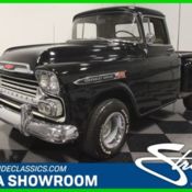 This 1959 Chevrolet Apache is a truck that needs no excuses. It looks great, it packs a fresh 283 cubic inch V8, and it's still practical enough to actually use as a truck. If you want a do-everything hobby vehicle, you could certainly do worse than this black stepside. Today, honest vintage pickup trucks that are still ready, willing and able to go to work are getting harder to find all the time. Fortunately, this one is ready to rock and that's all original steel that has never required major surgery, and the black paint shows it off to great effect. Instead, it has been properly maintained and lightly used for the past 53 years, and presents in solid condition today. The doors open and close solidly, the hood fits well, and the whole truck looks eager to get back to work. In the bed, you'll find a proper-looking bed that's finished in basic black, not polished like a dance floor, so you won't be afraid to use it. There's also a good bit of chrome on the top-of-the-line Apache, including the ornate grille, big bumpers, and those cool emblems on the front fenders, all of which are in good condition overall, although the rear bumper is showing its age. <BR The interior has been very nicely finished, and shows you just how basic these machines were when they were new. Forget luxury, these were little more than tools and nobody in 1958 was buying a pickup truck without needing to haul something. The seat features a new tan cloth cover, there's a correct rubber floor mat on the floor, and the door panels are finished to match the seat. The dash features a single stylish triangular pod for the speedometer, along with four smaller auxiliary gauges that are built right in, and there's an auxiliary gauge under the dash. You'll also note that it has the original "three-on-the-tree" 3-speed manual transmission, something familiar to more than a few of us who learned to drive out in the country. The big steering wheel makes it easy to wheel the truck around and it's surprisingly nimble given its utilitarian roots. The only notable upgrade is a new AM/FM stereo system that has been nicely integrated into the original dashboard. Pop that big hood and you'll be pleasantly surprised to find a 283 cubic inch V8, which was on the menu in 1958. Nicely detailed with Chevrolet Orange paint along with Chevrolet script valve covers and a chrome air cleaner, it looks right at home in the big engine bay. It uses an Edelbrock 4-barrel carburetor to help build power, but the overall look is very much in tune with the period. Underneath, it's exceptionally clean, from the frame to the suspension. A fresh dual exhaust system gives it a little bit of a growl, and there are no signs that this was ever a rusty truck. Manual drum brakes do their job properly and live inside a set of newer Rally wheels with fat 15-inch BFGoodrich T/A radials. Clean, honest trucks like this are getting hard to find, but they're worth the search. Imagine driving it to work on nice days, then hitting Home Depot or the local garden center on the weekends. Just because it's old and cool doesn't mean it can't earn its keep. This Apache is a solid, reliable, well-maintained truck that's ready for another 58 years of work.