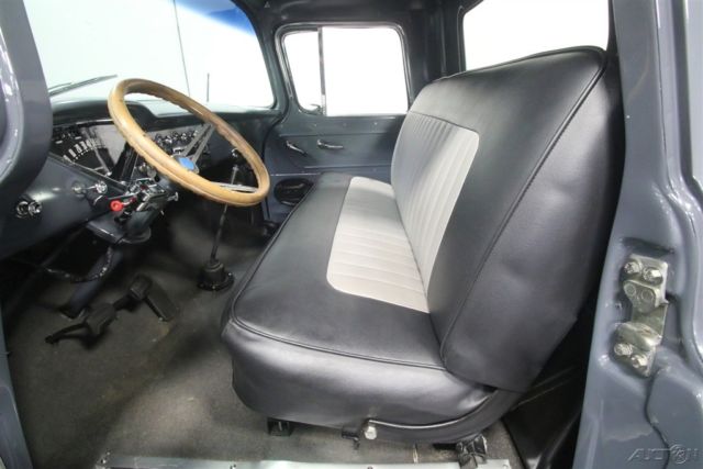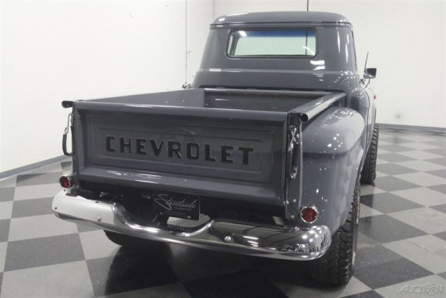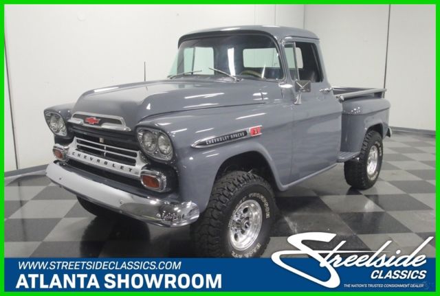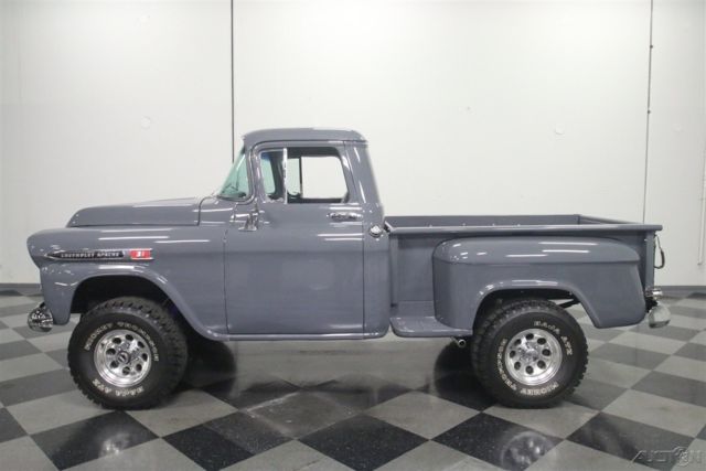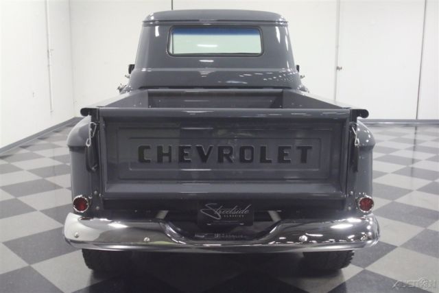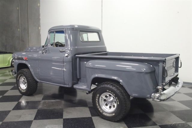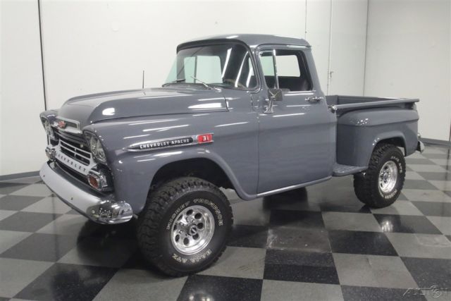 Cool hybrids like this 1959 Chevrolet Apache 4x4 make for ideal hobby vehicles. With a late-model chassis underneath and old-school looks on top, it does everything you want an old truck to do but with a lot fewer hassles. The fact that it looks like a million bucks and runs like the factory built it this way are merely icing on the cake. If you have a stepside Apache, you'll probably be shocked to learn that it's such a neat fit on an '80s K10 chassis, but here's the proof. At a glance, it looks like the factory built it, and that's purely intentional. They kept all the bodywork stock to give it that 1950s look, complete with the period-perfect paint job in battleship gray. The dramatically styled Apache pickups were some of the most handsome on the road back then and if you want attention, this truck will definitely deliver. The bodywork is nicely done, but not so perfect as to erase the fact that this is still a truck that's willing to work. Gaps are the way the factory would have done things and the paint has a shine that's better than anything available in 1959. The stepside bed gives it a muscular look and the especially with those oversized tires living in the fenders. Add in some brightly re-chromed bumpers, a factory grille, and a bed that's beautifully refinished with oak planks, and you get a truck that does everything extremely well. The interior is still basic, but the upgrades are visible throughout. The two-tone bench seat has pleated inserts to make it more comfortable on long hauls they worked hard to integrate the original controls with the modern chassis living underneath. The fat wood-rimmed wheel is easy to spot, but on the other hand, the original gauges remain fully functional monitoring the later engine. The original AM radio is gone, replaced by a digital AM/FM unit, and the 8-ball shift knob is linked to a 4-speed manual gearbox with a 2-speed transfer case behind it. Gray rubber mats help with the vintage pickup vibe and certainly sticks with the low-maintenance vibe. But that's the look and it works really well. The late-model chassis is from an '80s K10 pickup, and that included a great-running 350 cubic inch V8. Not dramatically modified, it sports a Holley 4-barrel carburetor on an aluminum intake manifold, but they were careful to keep it closer to its production roots rather than choosing a lot of modifications. Moroso valve covers and Chevy Orange paint brighten things up in a good way, and you'll note there's a big aluminum radiator up front to keep things nice and cool. The late-model swap also includes power steering and power front disc brakes, both welcome safety upgrades. Newer shocks along with dual steering stabilizers tame the ride quality to make this truck a pleasure to drive and the polished aluminum wheels and big 33x12.50-15 Mickey Thompson off-road radials look exactly right when on a lifted truck as beautiful as this one. A cool old pickup with a bit of a modern flair makes for a very usable package. Drive it, show it, take it to work, there's nothing this truck doesn't do well. Apaches are hard to find these days, and rarely do we see them restored to such a high level, let alone on a 4x4 frame. Call today!