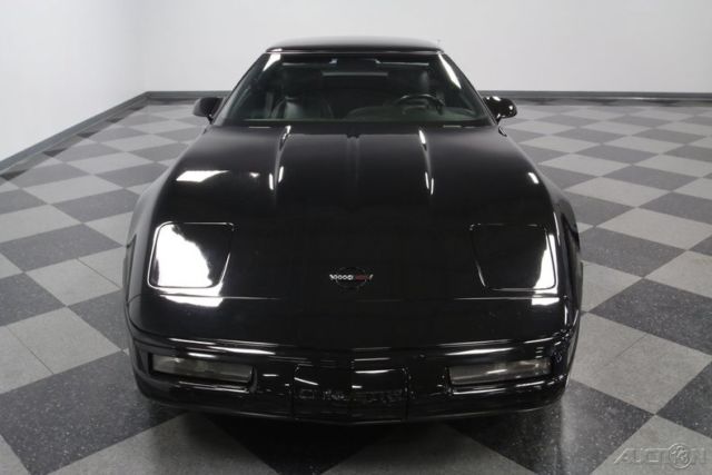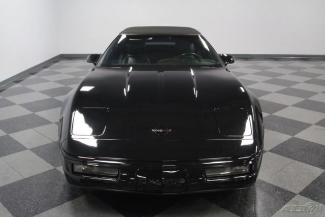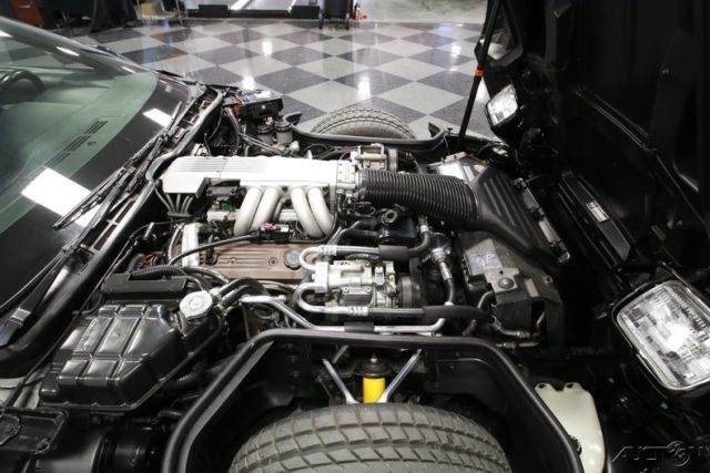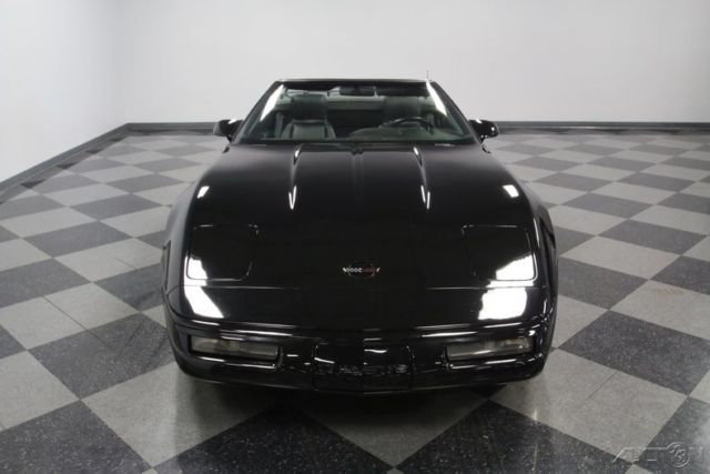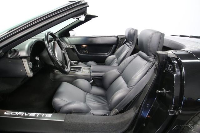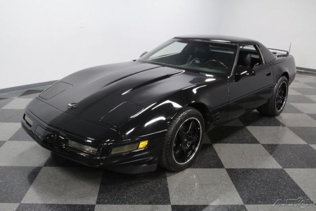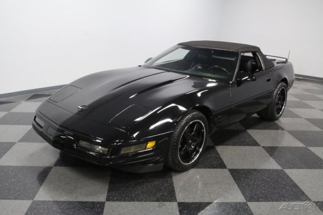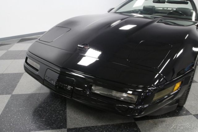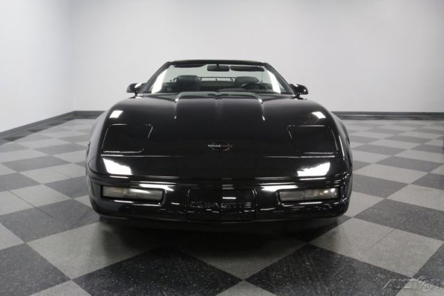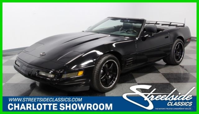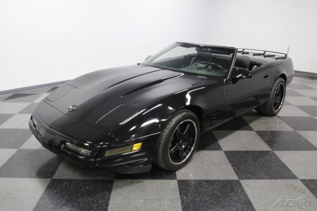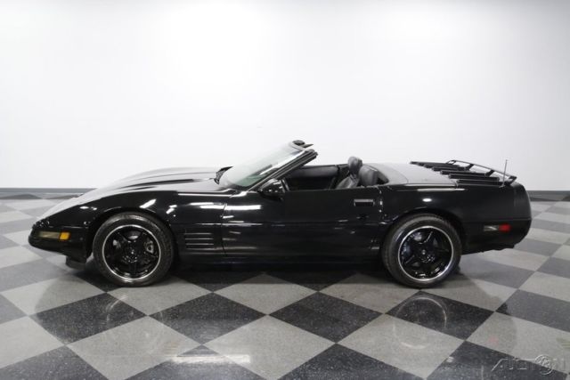 If Knight Rider were made in the '90s, this would be the car. After all, this is a 1991 Chevrolet Corvette convertible that's draped in so much slick black over every inch that even the wheels and the optional hardtop have a midnight attitude. But beyond the appeal of its looks, you're going to discover a classic American sports car that has received all the right investments to give it all the right modern appeal. This Corvette really does grab attention. The factory-correct black was given a professional respray about two-thirds through its life, and the investment in quality still shows in the high-gloss finish today. Plus, there has been the right effort to give this car a custom look without going eccentric. The black 17-inch ZR-1 wheels, black luggage rack that also integrates a rear spoiler, and the black removable hardtop all help create a total package that is both unique and intimidating. But more than just careful additions, you'll love this car because you can tell someone cared for it correctly. The way the doors shut with authority, the flush fit of the headlights, and the sharply creased body edges that make the C4 legendary are all pieces that tell you this Corvette has been respected from day one. While we love the way this one looks with the hardtop in place, when it's removed, it reveals an even more desirable black interior â€" after all, rarely do you find something more desirable than a triple-black classic. The leather seats were replaced within the last year, and so they know how to hug your body from the moment you sit down. Plus, they power adjust to make sure you get the perfect driving position. Another great upgrade is a modern AM/FM/CD stereo with amplified speakers. As expected from a premium sports car, this one comes loaded with power windows, power locks, cruise control, power steering, and a driver's airbag. Plus, the automatic climate control is there to keep you enjoying top-down motoring into the summer season. But if the weather does unexpectedly turn, you've always got the black folding soft top to keep everything secure. More evidence of a good ownership is in the engine bay. The 350 cubic-inch L98 motor is the same one that was installed at Bowling Green, Kentucky, and it still runs like a thoroughbred. That's because this original motor was rebuilt about 20k miles ago. It's also been upgraded with an MSD ignition, K&N air filter, and a rumbling sports exhaust. Out on the road you'll feel the difference in this C4 as the four-speed automatic now has a 2500 RPM stall converter. Plus, there's newer Koni shocks and the four-wheel disc brakes have been upgraded with drilled rotors. This is added to the power steering, anti-lock brakes, and a fully independent sports suspension, to make sure that this sinister dark car is capable of some devilish moves. Complete with owner's manual, this Corvette is a terrific classic. Just like Knight Rider, it looks mean from the first impression, but it has been upgraded to be your hero in disguise. So don't let this affordable midnight machine slip away. Call now!