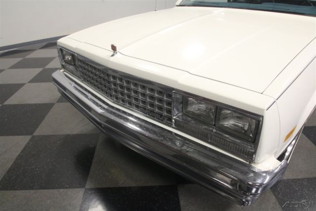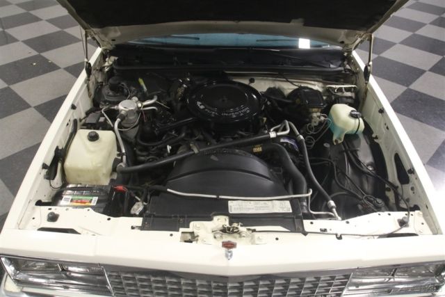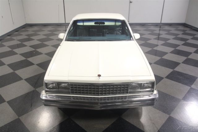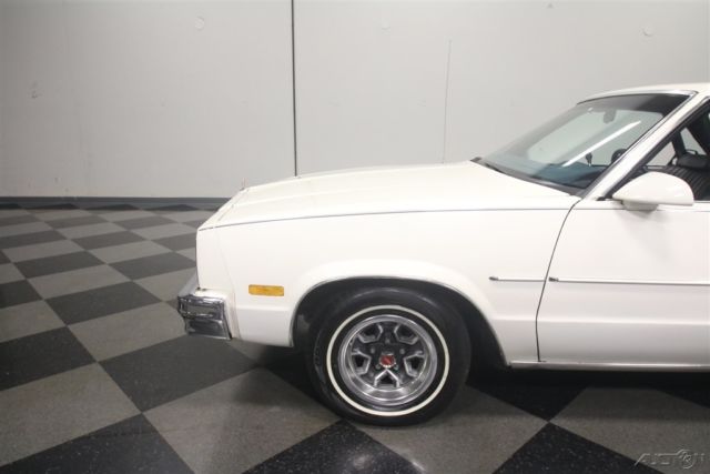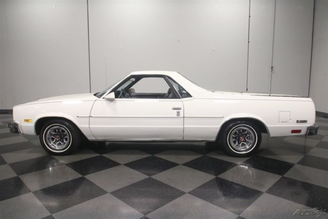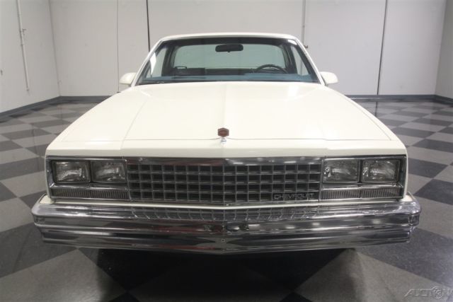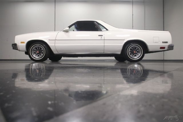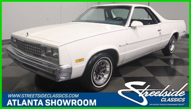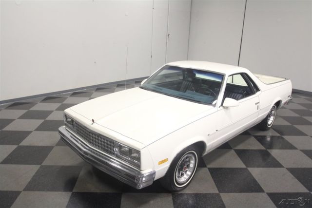 El Caminos, love 'em or hate 'em, are a unique piece of the American landscape. With decades of tradition behind it, this 1986 Chevrolet El Camino represents the end of the line for the Elky (the last one would roll off the assembly line in 1987), and presents in remarkably well-preserved condition. If you've been looking for one that hasn't been worked to death or modified beyond recognition, this might be your last chance. El Caminos were trucks, and most of them were used like trucks and left for dead when they gave up. Fortunately, this nicely preserved 55,681-mile example has most likely been a cherished toy for most of its life, and thanks to life down south where the roads are warm and dry, it doesn't suffer from the dreaded tin worm, either. The original white paint is simple, clean, and actually quite handsome, and the blue pinstripe gives it a sporty edge. Fit and finish are about average for a GM product of this era, but since it's original 30-year-old paint, we're still pretty impressed. There are a few touch-ups, but nothing major and original paint means no scary surprises waiting underneath. Talking about preservation, just take a look at the bed, which looks like it hasn't carried anything more substantial than a few sacks of groceries and still wears its original white paint. Nice, right? The interior is a nice combination of practical and stylish, a result of the El Camino sharing a lot of DNA with the Monte Carlo. Like the exterior, it's mostly original with few signs of wear and no notable damage to the seating surfaces beyond some minor stretching. The matching door panels are equally sharp, with no UV damage or cracking like you so often see on cars from the '80s, and the dash pad appears to be brand new. The El Camino was a bit sporty inside, too, with round gauge faces (although most are idiot lights), and this one is also loaded with options like A/C, a tilt wheel, power locks, and an AM/FM stereo radio. Aftermarket floor mats and a carpeted dash pad help keep it looking its best and from behind the wheel, it's easy to forget you're driving a vehicle with a pickup bed out back. Too cool! With just 55,681 original miles, the original 4.3 liter V6 still has a lot of life left in it. Essentially ¾ of a familiar 350 cubic inch V8, the big V6 is smooth and torquey, a great companion in the El Camino and as a relative of the small block Chevy, you know it'll run this well practically forever. As you might expect, the engine bay is super-sanitary, with all the factory equipment fully intact and 100% functional, including the fuel injection system that fires it almost instantly. There's no rust, no questionable upgrades, yet plenty of evidence of expert maintenance, including a fresh tune-up, belts, and hoses. It's backed by a 3-speed automatic transmission spinning a standard 10-bolt rear end, and if you're looking around underneath, you'll note this truck is really clean. Handsome painted Rally wheels finish the sporty look with recent whitewall radials. So El Camino fans rejoice, this clean late-model has been preserved for your enjoyment and is ready to go today. Call now!