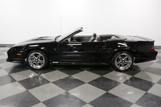 The well-presented full midnight package makes this 1991 Chevrolet Camaro Z/28 convertible instantly desirable. But when this loaded V8 droptop is also so affordable, has 48k actual miles, and is as clean as it is, well, then, you know it's a deal that won't wait for long. When you see a low mileage machine like this one, you know it has been cherished all its lifetime. The black paint even had a professional respray and polish to keep it looking glossy. And that's exactly what you want when buying a classic convertible. After all, its sunshine-friendly nature needs to look its best when you've got the top down and showing off all weekend long. But more than just the right color, this Camaro has a timeless sense of cool, and the 3rd gen. Camaros have been very hot. The hood inserts, factory ground effects, and nicely integrated rear spoiler all add to the sporty sleekness. Those 18-inch Ruff wheels add a touch of all-American chrome that connect this Camaro to its legendary predecessors. And because this black folding roof has a nice design and a taut fit, it works nicely with this total package. Averaging less than 1,800 miles annually means there was little time to wear out the seats. But it takes much more to make sure an interior has this stellar level of preservation. You can tell by the condition of the multi-tone gray cloth on the seats, side panels, and carpeting that there has been great care to button up this Camaro after any time it has enjoyed the sunshine. Like any good Z/28, this one came loaded right out of the box, including power windows, power locks, tilt steering, and cold air conditioning running modern R134a for easier servicing. You even get to power adjust your bucket seat to the ideal driving position. Having a modern classic like this means you even get a factory airbag in the steering wheel. Plus, there's an upgraded AM/FM/CD stereo with an iPod input so you can hear your favorite tunes even while the wind whips through the cabin. These third-generation Camaros are especially desirable for what's under the hood. After all, we all love a classic that also includes a fuel-injected V8. The 305 cubic-inch HO LB9 powerplant is original to the car, and it's known for being smooth on the highway, as well as quick off the stoplight. This Z/28 proves it's a great all-around around classic for even long distances with its four-speed automatic transmission w/overdrive, and you even have cruise control! Add in power steering, front disc brakes, and thick sway bars front & rear for the sport suspension, and you'll enjoy driving this classic droptop everywhere. Complete with owner's manual, this is the super-sleek convertible Camaro you've wanted for a long time. And with the affordable price on this low-mileage example, you no longer have to wait to fulfill that promise. Don't miss out, call today!