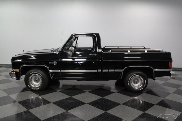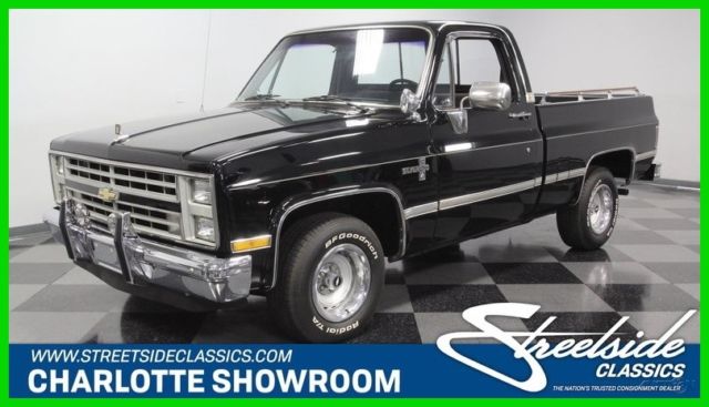 Loaded, vintage, and very dark, this 1986 Chevrolet C10 Silverado remains highly original from its V8 to the A/C interior. So if you want a classic truck without giving up creature comforts, read on... This Silverado makes a terrific first impression with its black and chrome. After all, the factory-correct color is actually called Midnight Black, and it has the kind of gloss that looks great in the moonlight. Plus, the full Silverado premium trim package is intact. So it includes full-length trim, shiny chrome bumpers, hood ornament, bright tailgate insert, and iconic Rally wheels. But there's also a lot of function in this form. For example, the added bed rails make it easier to tie things down (and the bed liner means you won't be afraid to do real truck work.) The rear step bumper has a trailer ball insert so if your considering getting a small, vintage camper, this classic truck can add some extra flair! Silverados were the top of the line, and this interior is an instant reminder. A comfy cloth bench seats with textured inserts, full carpeting, power windows, power locks, cruise control, and an AM/FM/cassette stereo all look original. And because they're all working nicely, this classic gives you the comfort of a modern pickup. But that sliding rear window provides an old-school breeze like no new truck can. Since the factory air conditioning is still blowing cold, feel free to open it up any time of year. Under the hood is Chevy's reliable 305 cubic-inch small block. This is believed to be the original V8 to the truck, and it certainly looks the part with all the right components in place and looking tidy. It fires up nicely, and the four-barrel carburetor makes job-ready power. Plus, you might have noticed the dual fuel tanks â€" another great option for those who love useful classics. Add in power steering, power brakes, and the three-speed automatic transmission, and this Silverado is a great all-around cruiser. Affordable, useful, and eye-catching, this is a terrific vintage truck offered for a terrific price. Don't let it slip away. Call now!