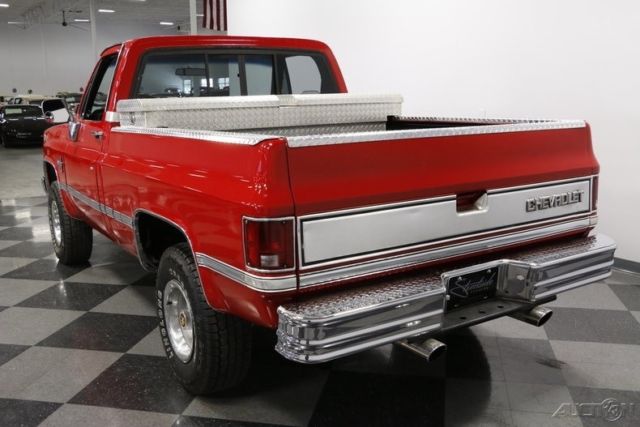 It's hard not to get excited about this 1986 Chevrolet K-10 4x4. After all it's a restored vintage pickup with a bright red presentation, upgraded A/C interior, overdrive transmission, and plenty of V8 power â€" and all offered for quite a nice price. This truck is out to impress without being ostentatious. You see it in the bright red paint that has the kind of gloss to instantly signal a nice investment. The almost seamless appearance of the premium Silverado side trim tells you the quality of the sheet metal. Plus, the bright work looks terrific on the billet grille, front bumper, and Rally wheels. But a lot more of this truck's shine also highlights its function. Items like the wide trailer mirrors, rear step bumper w/hitch ball attachment, and lockable Kobalt tool box are great practical pieces to have. And not only is the bed protected by the diamond plating on the sides, but also you have a full liner within. So this is the stunner that's ready to get to work. Inside, the comfortable cloth bench seat and matching black carpeting have the kind of fresh presentation that tell you there was a solid investment in the interior. There is plenty of room to fit three across, these Silverados are great for really focusing on the driver. That's why the dash is centered around you, and it's an easy reach to upgrades like the AM/FM/CD stereo with aux input for your iPod. It's also been upgraded for cold R134a air conditioning. Even with the cold air inside, we know your favorite breezes will come from opening the vent windows and sliding the rear glass â€" because that's what a vintage truck is all about. Under the hood is the right kind of Chevy small block power. It has been upgraded to a 350 cubic-inch V8, and it looks great among the newer components and Chevrolet performance air topper. The trusty small block inhales deeply through an Edelbrock four-barrel carburetor, and it exhales with authority as headers feed dual glass-pack straight pipes that finish in big 3-inch tips. The 4x4 drive train is the perfect mix of rugged and convenience as the two-speed transfer case engages the front wheels through the electrically locking hubs. Plus, with power steering, front disc brakes, and a four-speed automatic transmission w/highway-friendly overdrive, this is comfortable on both the street and trail. Vintage look, the right upgrades, and a value price â€" this K-10 Silverado has a lot going for it, so we know it will be gone soon. Don't miss out, call today!