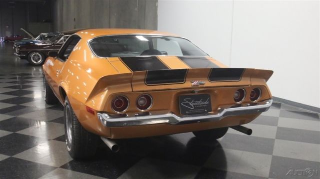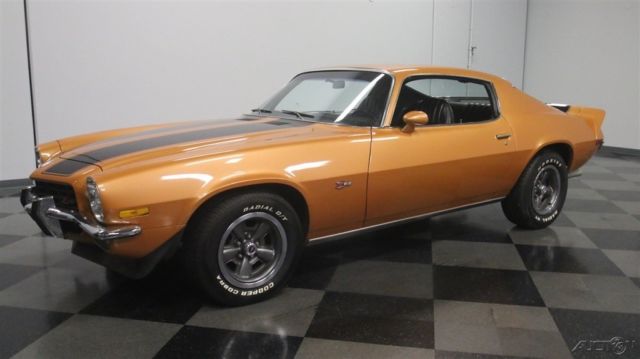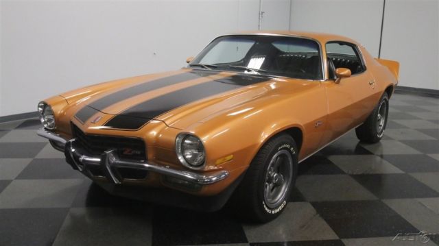 Second-generation Camaros are officially on collectors' must-have lists, and the best ones, like this 1973 Z/28 with matching numbers and a 4-speed are the investments of the future. Wearing its original color combination and some subtle upgrades, it's a car you can enjoy while it appreciates. Code 60 Light Copper is this car's original color, and it's both rare and attractive. With black stripes, there's still no denying that this car looks like a predator as it cruises through traffic. We've sold more than a few second-gen Camaros recently, which confirms their growing popularity, and this one is nicer than most and really stands out. Given its matching-numbers status and a relatively rare 4-speed transmission, someone gave it a quality paint job about 10 years ago, so it looks good with only a few minor signs of use and wear. Lots of tedious block sanding was surely involved, but it paid off, because when the paint went on, the bodywork looks great, even today. As a result, the glowing two-stage urethane paint has a decent shine (a professional buff job would probably wake it up), gaps are pretty, and the car looks the way you'd do it if you were doing it for yourself. It's nice to see that it wasn't dressed up in fake RS regalia, the hood is stock, and yes, that towering rear wing is how they came from the factory. If you're a fan of these cars, you already know what a great place the interior is. With comfortable, supportive high-back buckets draped in supple black vinyl, you know they're serious about performance. The interior is mostly original, from the aforementioned seat covers to the door panels to the carpets to the dash pad, all of which are in good condition, although there's a little curling in the dash pad. The 4-speed transmission and minimal options suggests that someone was looking for all-out performance and this car would have been a legitimate threat on the streets in 1973. To keep an eye on the engine, an aftermarket oil pressure gauge was installed in the dash, and it's quite neatly done. A later AM/FM/cassette stereo seems appropriate in this disco-era muscle car, and there's a Hurst shifter on the transmission, but those remain the only modifications to the interior. The trunk is tidy, and includes a spare wheel plus a space saver spare tire assembly for emergencies. At least the Z/28 got the fastest, most powerful engine available this side of a Corvette, a 350 cubic inch V8 rated at a rather stout 245 horsepower thanks to increased compression and a 4-barrel carb. Nicely dressed with finned aluminum valve covers that recall the original Z/28 and a chrome air cleaner that ensures the engine has enough to breathe, it definitely cackles and snarls the way you'd want your vintage muscle to sound. There's also an Edelbrock aluminum intake manifold, a GM HEI distributor at the back of the block, plus long-tube headers to help build torque. Chevy Orange on the block stands out against the otherwise monochromatic engine bay, but it doesn't look like this car has ever been apart, which is nice. The 4-speed shifts easily and all Z/28s received 3.73 gears out back that make it rather quick off the line. Underneath there's a newer exhaust system that sounds great, reasonably clean original floors, and the original alloy wheels are in excellent shape, wearing 255/60/15 performance radials. Fast, fun, stylish, and ready to rumble, these cars are hot. If you're even remotely considering this one, don't hesitate, because history shows us that the good ones just don't stick around. Call today!