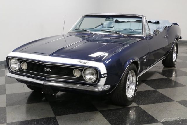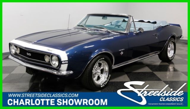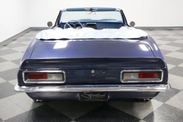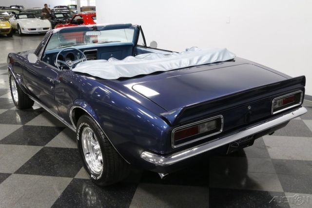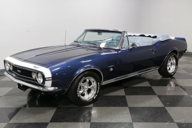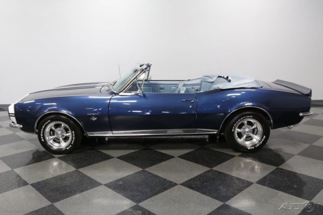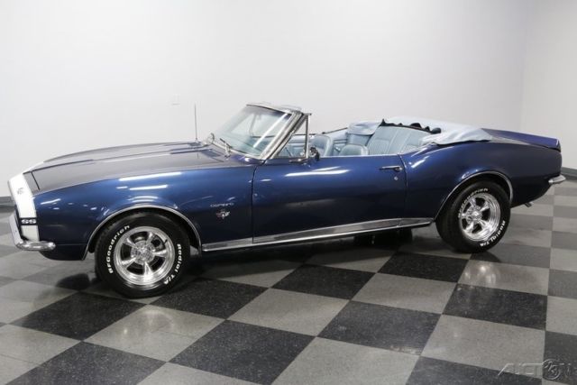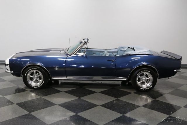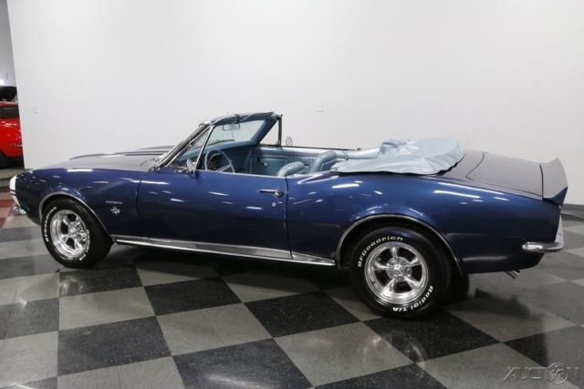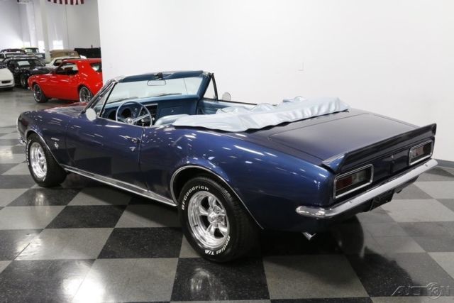 Rare, distinctive, and loaded with LS1 fuel-injected power, this 1967 Chevrolet Camaro convertible is a sharp cruiser with some terrific power. The first thing that you'll notice about this convertible is the paint. The dark blue is a great color for modern times, but in fact, it's the factory-correct Deep Water Blue. Only offered in '67, it's also one of the rarest hues applied to a first-year Camaro. But more than just history, you love the deep tones. And because it's a modern respray (and there's less than 200 miles on this car since completion) the slick paint really highlights the curves of the Camaro's sheet metal every time the sunlight shines on this sunshine-friendly drop top. Plus, like any good American classic it has nice bright work on the wraparound bumpers, windshield surrounds, rocker panels, and upgraded American Racing Torq Thrust wheels. But your favorite part might just be the white D91 "Bumblebee" stripe. After all, it coordinates so nicely with the white top. But a car like this was meant to be open to the world. That's why it's so great to have the factory-correct blue interior. With the top cover in place, the two tones of blue flow from the interior to exterior, and give this American classic a hint of European flair. The color on the bucket seats matches the door panels, carpeting, headliner, dash, and even the steering wheel. All of this is in remarkable condition, so you know this has been cared for correctly. This classic still retains its correct center console, but now you'll notice provisions for an upgraded radio and a full set of upgraded auxiliary gauges. As you slip behind the wheel, the large Dakota Digital speedo and tach are an instant sign there's something much more modern under the hood. The heart of this beast is an upgraded 5.7-liter LS1. So this is more than just an SS-tribute, because it can run circles around the originals! You'll love popping the hood at all the car shows and watching everyone marvel at the modern V8 and custom painted engine covers. But beyond just adding a modern fuel-injected motor, this one has been upgraded with go-fast goodies. It inhales deeply from a cold air intake, and the V8 exhales with authority through headers connected to a stainless steel dual exhaust. Besides just having a wicked growl, it can keep cool while running hard thanks to an aluminum radiator and electric fan. This V8 screamer needs stout parts to get all the power to the ground. This is why you have the updated 4L60E four-speed automatic transmission, and that feeds a strong 10-bolt rear end that includes Positraction. But all this power is nothing without control. That's why you get power steering, wide BF Goodrich T/As, and an upgrade to front disc brakes. Complete with build receipts, this is the perfect classic Camaro for power driving or overdrive cruising â€" and so it's ideal for it all! That means you have a rare treat that can be easily shown off anywhere. So don't miss out, call today!