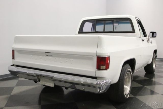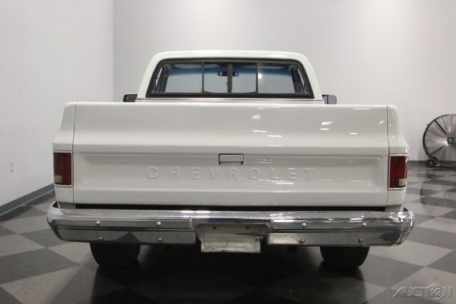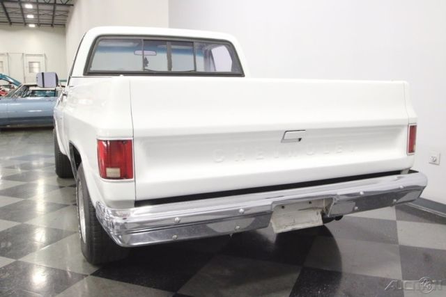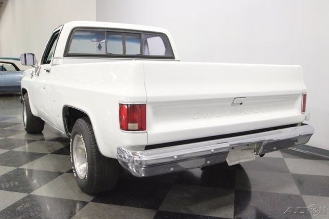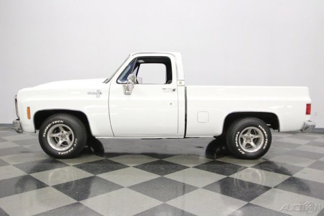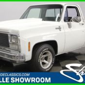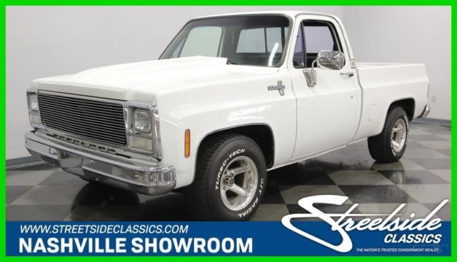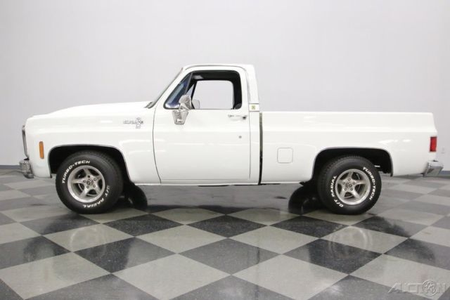 Neat and clean in White with splashes of chrome, this is a great looking Silverado. The mid-70s pickups are more popular than ever these days. They have modern classic styling, drive well, and are capable of getting the job done without a pile of computers complicating things. Check this one out. The crisp clean body lines of this pickup are a great starting point for the look of this truck. From the side you see a crease running down the mid-line from front to rear. That is paralleled by the top line of the fender that flows cleanly along the top of the door and then the bed. It gives the truck a really solid look. There is a Silverado badge on the fender and a splash of chrome trim around the wheel wells. Up front a chrome billet grill of horizontal lines keeps the look clean and is underlined by a simple bumper. The cowl induction hood hints at the beast within, but does so without screaming it out with a bunch of stripes or lettering. Things are kept equally simple and clean out back in white and chrome and the bed has been coated with spray in bed liner. Complementing the look are 5-lug Eagle polished alloy wheels. Open the door and you will find a stock interior that is a comfortable place to put some miles in or get some work done. The door panel has controls at your fingertips for the power windows and locks along with a comfortable armrest for cruising down the road. A 4-spoke steering wheel mounted on a tilt column with the shifter for the automatic transmission sits in front of a stock dashboard. The tach and speedo are front and center with the fuel, temp, oil and voltage gauges off to the left. Ventilation controls, including those for the updated R134 air conditioning to keep you cool are in the center. A Kenwood stereo is there for your listening pleasure and there is a sliding back window. The cloth bench seat is comfortable with plenty of room for three across with the shifter being mounted on the column. Pop the hood with the big cowl induction bump on it and you will find a very healthy, 454 cubic inch, big block. There is a chrome air cleaner topping an Edelbrock 4-barrel carburetor and Edelbrock Performer 2.0 intake manifold. Those 454 valve covers nestled under the alternator and A/C compressor shine through because they are polished up chrome, and because big block valve covers are huge. There is a new brake booster and master cylinder along with a new battery and newer belts and hoses. Long tube headers get the exhaust heading back through glass pack style muffler that give the truck a healthy sound and the power flows back through a 3-speed automatic transmission to the rear wheels. Front disc brakes provide good stopping ability and the rubber meets the road through 255/70R15 tires all around mounted on those great looking Ridler wheels. Neat, clean, comfortable, and more than capable with a healthy 454 under the hood. Come on down and check out this Silverado.