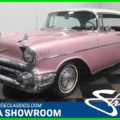 A little original, a little restored, and a lot of personality define this 1957 Chevrolet Bel Air hardtop sedan. It offers fantastic features like that Dusk Rose paint, which is its original color, plus a great-running 283 cubic inch V8, power steering, and plenty of recent work. It's hard to say where the line between original and restored parts is, because this car has an all-of-a-piece look that's quite appealing. No, it's not quite perfect, but the repaint looks great and it has that great look that comes from years of care. The paint accurately represents the original color and while there are signs of use, you can consider all that stuff as badges of honor. The 4-door hardtop styling is almost indistinguishable from the 2-doors unless you count door handles, thanks to some clever styling by the guys at GM and you simply can't go wrong with a '57 of any kind. This is the car's original color combination and it works well on the '50s cruiser, especially with fender skirts and all that chrome, most of which is in very good condition. You're either man enough to handle this Bel Air or you're not, but if you're not, you're really missing out. The interior is nicely restored and very correct, with two-tone gray and black upholstery with funky brocade inserts that are quite correct for 1957. The carpets were replaced at the same time, as well as the door panels, so it all looks quite nice, particularly in back where it has hardly any sign of use. Original gauges look decent and there's a factory AM radio in the center of the dash and miraculously enough, it works like it should. The steering wheel shows some signs of age but no major cracking or crumbling and the bright trim that spans the dash is in excellent shape. Heavy-duty rubber floor mats protect the floors and there's a handy set of cup holders on the transmission tunnel, suggesting that this one was built to cruise. A nicely finished trunk includes nicely tailored black carpets instead of the original rubber mat, plus a full-sized spare with a matching cover and a proper jack assembly. The engine is a 283 cubic inch V8 that looks exactly right under the hood of this Bel Air. It's properly detailed with Chevy Orange paint, a heavy-duty air cleaner, and stamped steel valve covers with Chevrolet script on their faces, a refreshing change from all the over-chromed cars you see a shows. The big air cleaner dominates the top of the engine bay, but you'll also note a correct generator/power steering pump assembly, another desirable option, as well as a windshield washer system. There are plenty of signs of care and maintenance over the years, and it does run and drive well thanks and sounds great burgling through a recent dual exhaust system with glasspack-style mufflers. Backed by a 2-speed PowerGlide automatic transmission, it's fun to drive and eminently practical for the hobbyist with a family. The chassis is fairly original but it's extremely clean with just a light dusting of undercoating to protect the metal. Factory steel wheels with hubcaps are the right choice and carry recent 215/75/14 whitewall radials. Icons don't get much more affordable than this and with several desirable options and a cool color combination, it's a very worthy car for the guy who wants to take it to the next level. Call today!