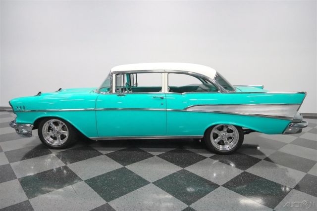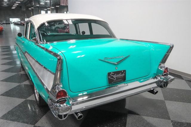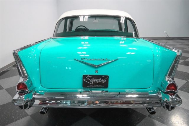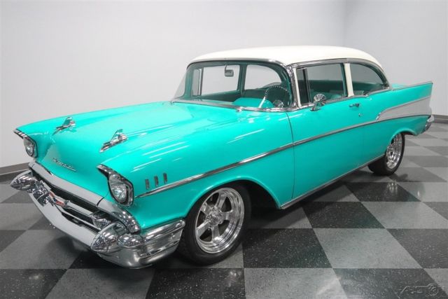 The 1957 Chevrolet Bel Air two-door sedan is already in-demand because it's iconic. But to take it to the next level like this one, you need bold paint, serious V8 power, and an exceptionally fresh presentation that has less than 1,000 miles on it since the full frame-off restoration. So this is a custom and thoughtful build that shows us what happens when someone invests in quality. The glowing turquoise is the exact right color for this classic. There were hues like this available from the factory, but this modern clearcoat finish is far bolder... and that sets the theme correctly for this Chevy. It has an excellent glow that rolls evenly in the sunshine, which tells you there was the right kind of investment in getting this modern sunny color applied correctly. Plus, the white roof adds to this car's period-correct appeal. And of course, there's the brightwork. It all has a mirror-like shine that takes this Bel Air back to day one. More than just bright, there was a solid investment in the body. That means everything looks nearly seamless â€" from how the hood rests into the grille to the full-length trim line that helps form the iconic tailfin. But more than just aesthetics, this one gets its fundamentals right, too â€" the glass is clean and clear; the lights are bright; and the doors shut with authority. So it's a cool cruiser with an anytime driving attitude. The turquoise theme continues inside as the fresh interior showcases the ideal mix of vintage and new. For example, the seats follow a similar pattern to the classic Bel Air, but now these custom benches are given individual bolstering for all-day comfort. These seats nicely match the door panels and dash for a very uniform appearance. As you look over the whole interior all the upgrades seem to be done with careful thought. The cup holder center console nicely matches the carpeting. The chrome Ididit tilt steering column and upgraded sports steering wheel have the kind of shine that nicely fits with '50s nostalgia. The original gauge housings now have Dakota Digital VHX readouts to give you more complete info. And while the radio looks like a vintage knob-style unit, it's really a digital tuner that offers modern amenities like USB inputs and full Bluetooth capabilities. And if all of this didn't already have you convinced this is a cool cruiser, there's even modern R134a air conditioning! Grab your sunglasses before opening the hood, because we dare you to find another component that can be polished. There has been a huge investment in time and money for such a tidy and shiny presentation. So we bet the engine bay will win awards all on its own. And since this car is fresh off of restoration, the motor really is as fresh as it looks! This 350 cubic-inch crate V8 has much more going for it than just the shine. Behind the style is the substance of performance upgrades like a large Edelbrock 750 CFM four-barrel carburetor, Edelbrock intake, and shorty headers. This full package is estimated to make 325 horsepower, and the growl of the X-pipe dual exhaust lets everyone know it. But more than just powerful, this was built to reinforce its easy cruising attitude, too. That's why you have features like the aluminum radiator w/electric fan to keep it all running cool even if you're in traffic with the A/C pumping. The full Jim Meyers front suspension gives this a solid feeling on the road, and the Wilwood four-wheel disc brake package gives you superior stopping power. Plus, the four-speed automatic transmission w/overdrive, power steering, and cruise control make this a terrific highway classic. This is an amazing build, and you can take others on this icon's transformation thanks to the full paperwork file. It includes a full restoration photos book, full manuals for the upgraded components, and binder with itemized receipts documenting the huge investment in the Chevy. It's everything you want in one iconic design. So hurry before someone else grabs your dream Bel Air. Call today!!!