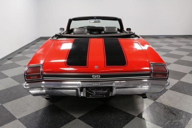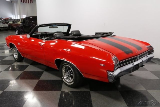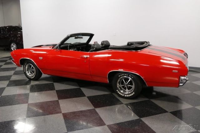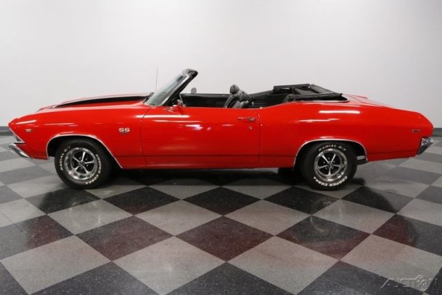 A 1969 Chevrolet Chevelle Malibu convertible will always make a great first impression. After all, the factory drop tops of this muscle car legend are rare. But when you can have one with proper SS tribute features, A/C interior, cool color combo, and a big block under the hood, then you know you're looking at the standout among standouts. Nothing but red and black is exactly how you want a muscle car to look, and so this has been prepared that way. The upgraded fiery paint is part of a later respray. So while it's not perfect, it still has that unbeatable clear coat shine every time you take this convertible out for a cruise â€" exactly what you want in a sunshine-friendly drop top. With the black SS stripes painted on, it makes for a fantastic coordination with the blacked-out grille, blacked-out tail panel, sporty SS wheels, and power convertible top. So this one really does know how to command attention. The form-hugging bumpers have a mirror-like shine, and it matches nicely with the half chrome covers on the headlights. Plus, the larger cowl induction hood is the perfect upgrade in aggression. With the flip of a switch, the black electric folding roof reveals a nice black interior â€" so this drop top has a great overall appearance with the top up or down. Everyone loves to see bucket seats and a center console in a muscle machine like this, and it comes complete with the iconic horseshoe shifter. This convertible feels nice inside with the carpets, door panels, and dash all retaining their deep, dark appearance. The driver gets the factory three-spoke sports steering wheel that gives a commanding view of everything. This includes the upgraded gauge package with tach. This is a terrific cruiser with everything from an auxiliary readout trio to an upgraded AM/FM/CD stereo for the best in top-down tunes. And since you'll want to cruise as long as possible with the roof off, the factory air conditioning is blowing nice and cold. This is the kind of motor that will make you proud to lift the hood at car shows. The big block 396 cubic-inch V8 is exceptionally well presented with its orange block paint, shining valve covers, and cross-flags air grabber. If you look closer, you can spot useful upgrades such as, the Edelbrock four-barrel carburetor, new plug wires, and a new electronic ignition. The long tube headers add even more power as they also contribute to the rumble of the dual exhaust. The total power package reliably gets to the ground via a stout GM three-speed automatic transmission. Plus, control stays well in hand thanks to power steering, power brakes, and raised letter Cooper Cobra tires at all four corners. Chevrolet only built 8,950 Chevelle drop tops in 1969, making them a very rare commodity nearly a half-century later. So to find one so nicely presented with a growling V8 under the hood is the kind of treat that doesn't come around very often. Don't miss out, call today!