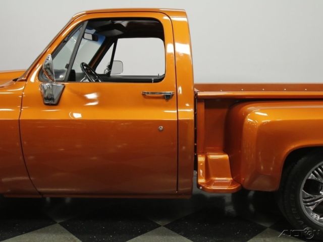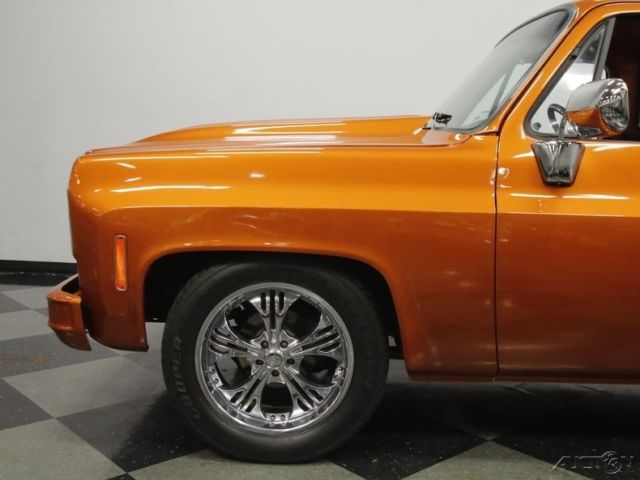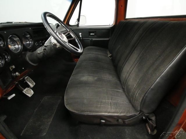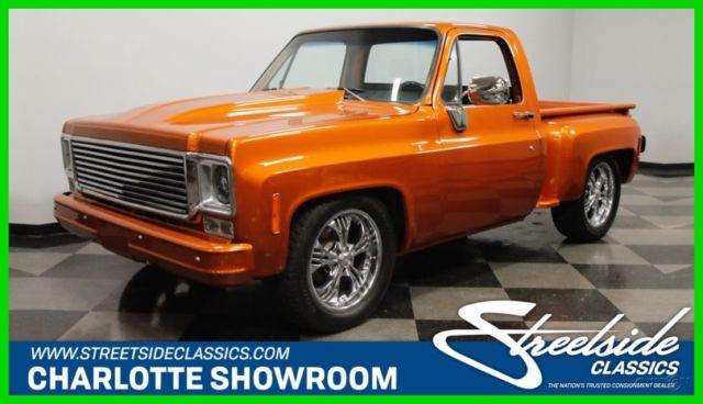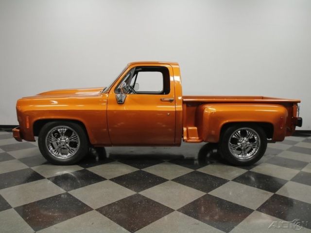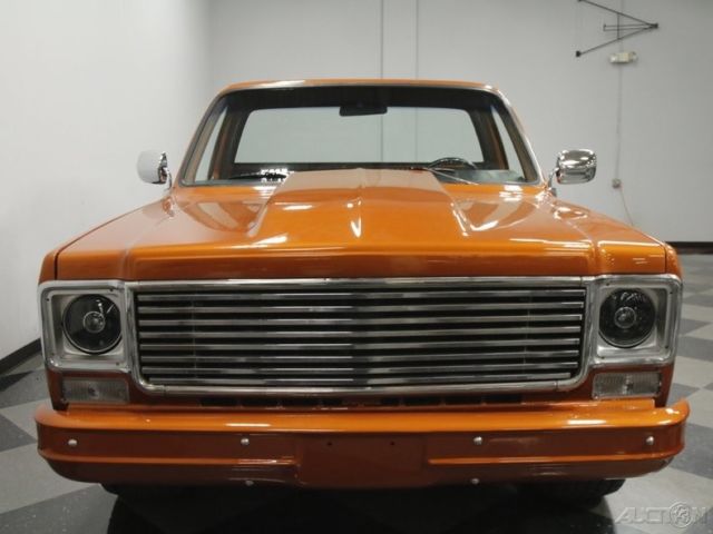 Pickup trucks are no longer just about utility. Some have been invested in to turn heads, and this restored 1977 Chevrolet C10 Custom Deluxe sure proves it. With the crisp orange paint, aggressive custom touches, comfortable interior, and low miles, you can't help but be impressed. The Atomic Orange caught your attention and won't let go...that's how it is for everyone else, too. This fresh application of the high-gloss paintwork was very well thought out. That's why much of the trim was removed from this pickup. After all, nothing can beat the shine that comes from investing in the right professional paintwork. But more than just the orange, this pickup has some real attitude. The stepside bed has that great flared fender appearance that helped start the vintage custom truck movement, and there's a good amount of time invested in making the whole C10 look this good. You can see it up front with the bright grille and high intensity headlights that mach the silver and gray appearance. Add to that the painted bumper and tall cowl hood, and that's a bold first impression. The sides have a lowered profile and bright 20-inch custom alloy wheels. Plus, there's no mistaking the look of that custom bed, complete with tough lining and new lumber redone in furniture-grade finish. It all ends with a custom tailgate and a rolled rear pan to give a fully unique appearance. Inside you get a bench seat that's covered in a comfortable cloth. This coordinates nicely with the black carpeting, doors dash, and custom three-spoke steering wheel. The bright exterior orange continues as an accent color on the doors and dash to add some color to this sinister-like deep dark interior. Plus, this interior/exterior color link adds a great uniform touch that the best vintage trucks have. Under the hood is Chevy's trusty 350 cubic-inch small block V8. The new components, panted block, and tidy belts & hoses all tell you this has received the right care and maintenance. Of course this is also the best motor to have for utilizing the vast and inexpensive upgrades available to best of the small blocks. But right now you're already producing the kind of power that makes this pickup a fine choice for work or play. In fact, with features like the TH350 three-speed automatic transmission, power steering, front disc brakes, and the modern grip of Cooper Discovery tires, this custom C10 is already turnkey ready to be a great anytime pickup. There's been a lot invested here to make this truck go well beyond '70s cool. It's an attention-grabbing vintage Chevy with only 75,130 miles. So this is one restored pickup that will draw them in and have a story to tell, too. Call today!!