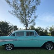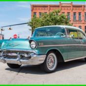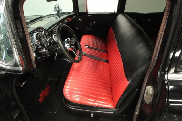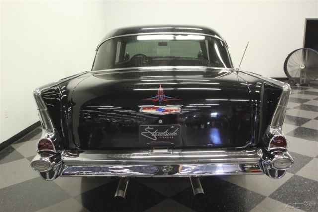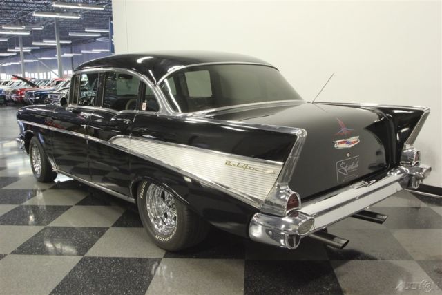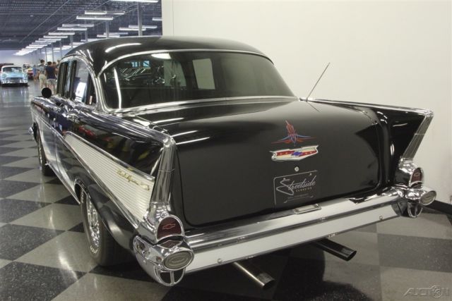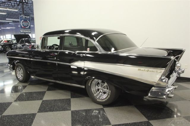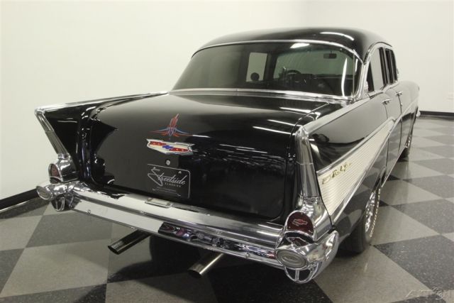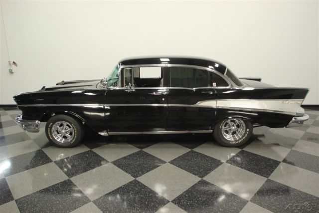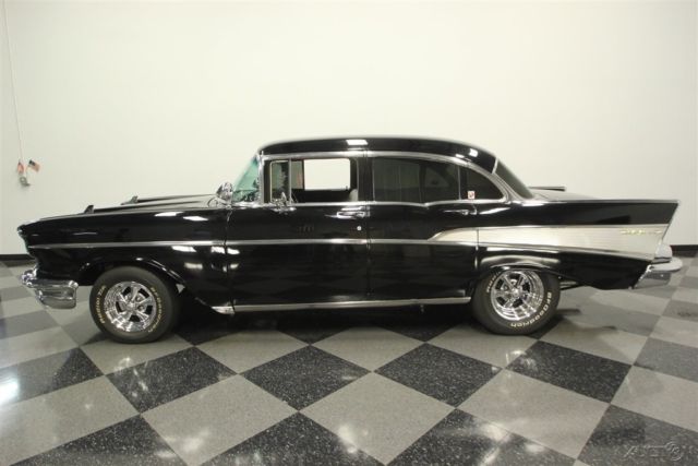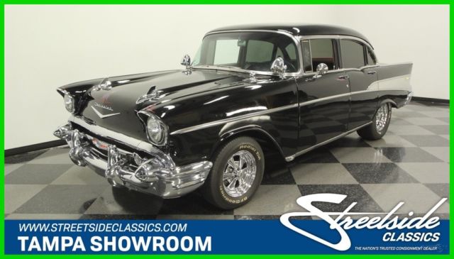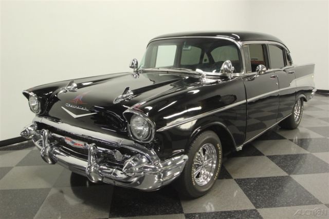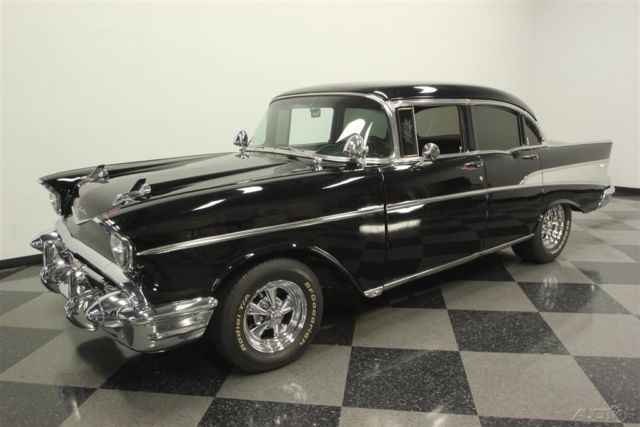This 1957 Chevrolet Bel Air sedan is an iconic classic with a dark shine, and it's all offered for a value price. But what will really make you want this one is the way the crowds will gather as you show off its upgraded V8 power. A '57 Chevy is a true icon of American motoring. So when it has been given an upgraded appearance with deep black paint buffed to a mirror shine, then you know it's ready to show off. In fact, since they knew this was ready for primetime, the iconic bumpers were re-chromed for a true mirror-like presence to rival the paint's shine. Plus, there's a ton of great custom touches like the dual spotlights, large dual exhaust tips, and much more. Our favorite has to be the custom pinstriping on the one piece hood, trunk, and above headlights to add a little color flair to the deep black. And those iconic Cragar SS wheels are a great way to add some shine while also signaling to some upgraded power (more on that tin a moment.) The interior does the same job of adding a ton of custom work while still respecting the Bel Air's history. For example, the two rows of bench seats have the classic-style presentation, but now that they're finished in a vibrant two-tone black and red. It really signals this Chevy's more aggressive attitude. Plus, newer carpets and headliner keep it all feeling fresh. There's even a retro-style AM/FM radio with digital tuner to keep this feeling vintage while offering upgraded cruising tunes. But when it comes to speedy pieces, this Bel Air makes its presence known. You get the tingle of performance as your left hand grabs the Grant sports steering wheel, and your right one rests on the B&M shifter. Plus, with the upgraded gauges, including a large column-mounted tach, you get to know exactly what's going on under the hood. While a Bel Air is sure to attract a crowd, all you have to do is show off the engine bay, and people will come running towards this one. After all, the entire front end tilts forward for a very custom and sporty presentation. Because everyone can see the motor much better, it has been dressed to impress. Nearly every component was polished â€" from the large air grabber, to the valve covers, to the upgraded pulleys. More than just look fantastic, this motor was built for performance. It's a 350 cubic-inch small block that was enhanced with an Edelbrock four-barrel carburetor, Edelbrock intake, and Hooker ceramic-coated headers. There's even a Champion aluminum radiator to keep it all running cool. While the growl of the dual exhaust lets the world know it's a performance machine, there's much more going on here. There are great easy driving features like the three-speed automatic transmission, power steering, and front disc brakes. Plus, with the cool front end being made of lightweight fiberglass, it gives this classic a better balance on the road. With all this attention to detail, you get an icon that has a spirit all its own. So at an affordable price like this, you know you need to hurry if you want to take this '57 Chevy home. Call today!!!