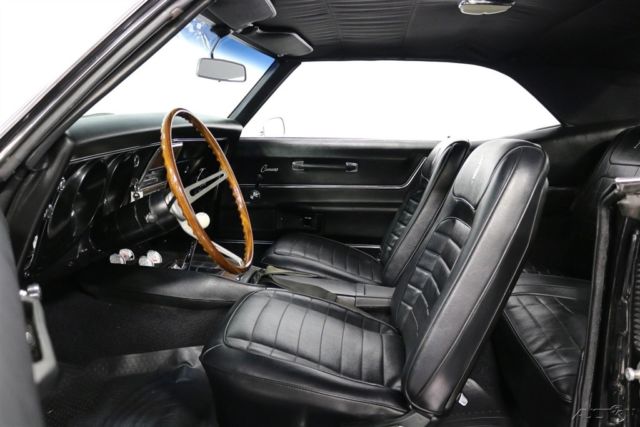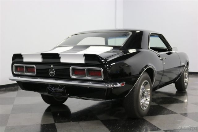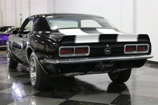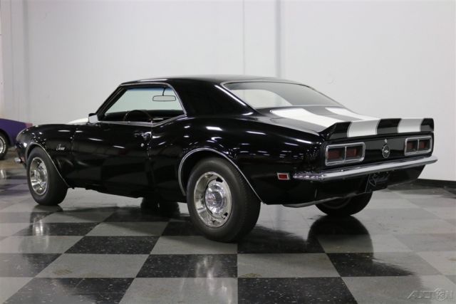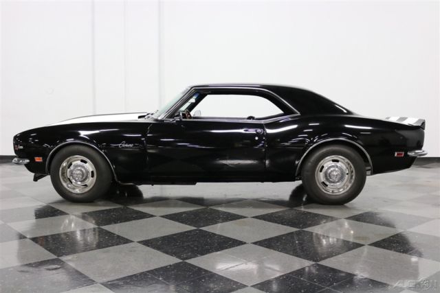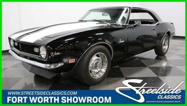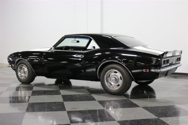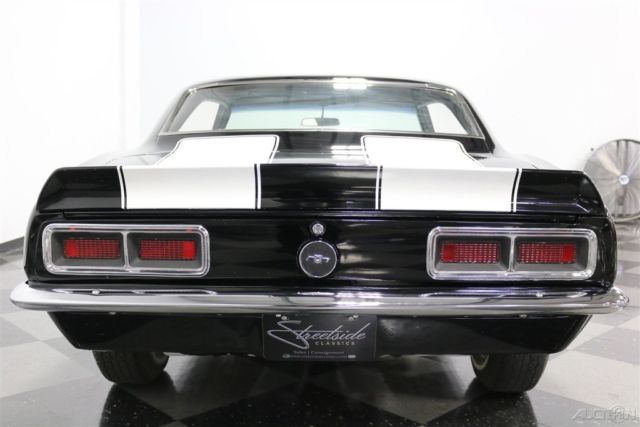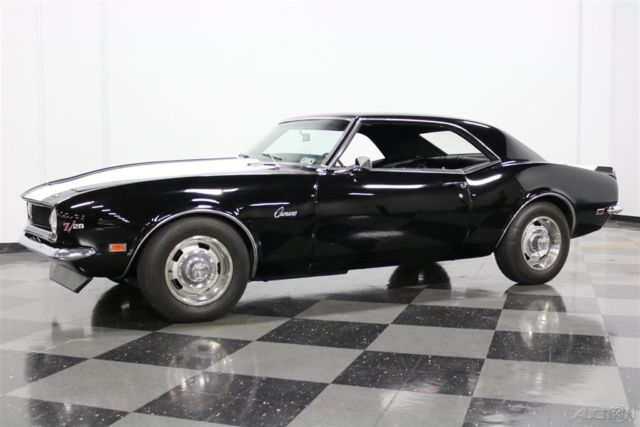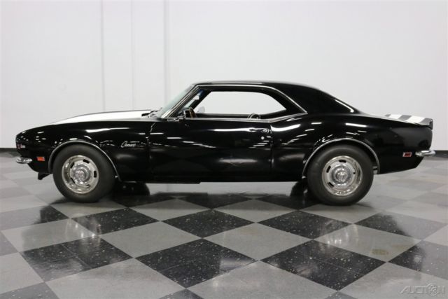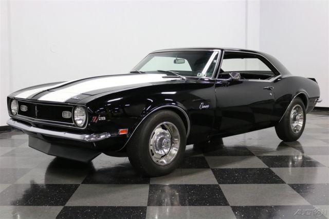 This 1968 Chevrolet Camaro Z/28 Tribute will afford some lucky classic car enthusiast the rare opportunity to get behind the wheel of a sharp looking, strong running first generation specimen of one of the most pivotal models in modern automotive history at a great price. Even better, this Camaro's road readiness offers plenty of fun-filled miles in its already attention getting condition. It's easy to forget that the Camaro was a fairly late entrant into the muscle car wars that had taken center stage among performance-minded car buyers by the mid-'60s, but one quick glance at this '68's first generation form provides plenty of evidence that Chevy got things right the first time around. That winning "long hood, short deck lid" plays out to great effect here and the black paint, ornamented by broad white painted stripes down the cowl hood and deck lid, provides a killer look. There's no doubt that this vintage Chevy will turn plenty of heads in its present condition, but a little wet sanding would definitely take things up a notch. All its badging, including the Z/28 emblems positioned on the front bumpers as a nod to this car's upper crust Chevy inspiration, are securely in place and the cabin is surrounded by clear glass that features rubber seals in good condition. The interior was nicely restored a while back, and definitely has a lot to offer. The black vinyl covers on both the front buckets and rear bench seat show very little wear, with plenty of padding left to indicate they haven't seen a lot of use over the years. Resting between the buckets, the center console is in very clean condition, featuring fresh woodgrain inserts that surround its white balled Hurst manual shifter as well as the four AutoMeter gauges positioned just a little farther forward that join the new-looking counterparts residing in the instrument cluster behind a woodgrain steering wheel. A supple-looking, crack-free dash pad - always a welcome sight with UV sensitive black upholstery - runs the width of the cabin just above. The trunk area looks to be in good order, with clean vinyl lining its floor and a fresh rubber gasket sitting just below its deck lid to keep the elements from intruding. Anxious to get out on the road and enjoy yourself? You'll have no problems here. The 350 cubic inch V8 under the hood starts very easily and runs smooth, sounding out a strong, even exhaust note in the process. It sits in an orderly engine compartment, surrounded by fresh hoses and orderly wiring wearing a chrome Edelbrock air cleaner over its matching 4-barrel carb and intake manifold, as well as a pair of chrome valve covers on its sides. The powerplant teams with a 4-speed manual transmission that's shifting with precision to provide just the "hands on" vintage driving experience a classic like this deserves while a look below will show a solid undercarriage. Smooth power steering makes this Camaro an easy navigator, while power front disc brakes provide dependable, fade resistant stops as this coveted Chevy cruises on a set of 15" stock wheels wrapped with all season radials. Sound, strong running first generation Camaros aren't very easy to come by, so this 1968 Chevrolet Camaro Z28 Tribute is a welcome find. Call today!