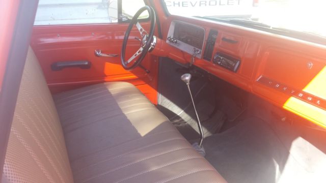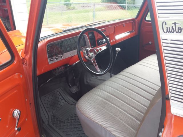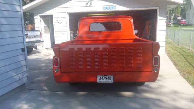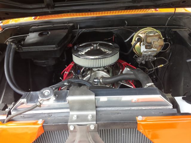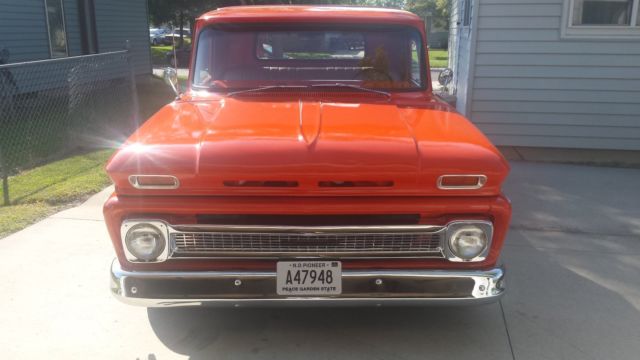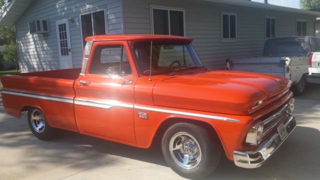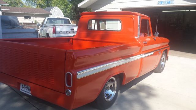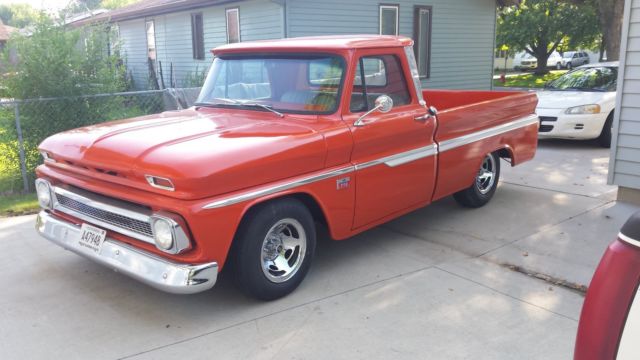 | 1966 Chevy C10,SWB 2wd, hugger orange, 350 engine, turbo 350 trans, Camaro rear end, power steering, front disc brakes, five lug wheels, Lokar shifter, new aluminum radiator, new Holley carb, headers, 3" exhaust, stereo,nice paint,great interior, rear roll pan, new tires, sits nice-very sharp truck. Inspection welcome |