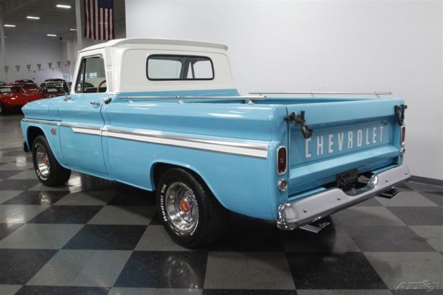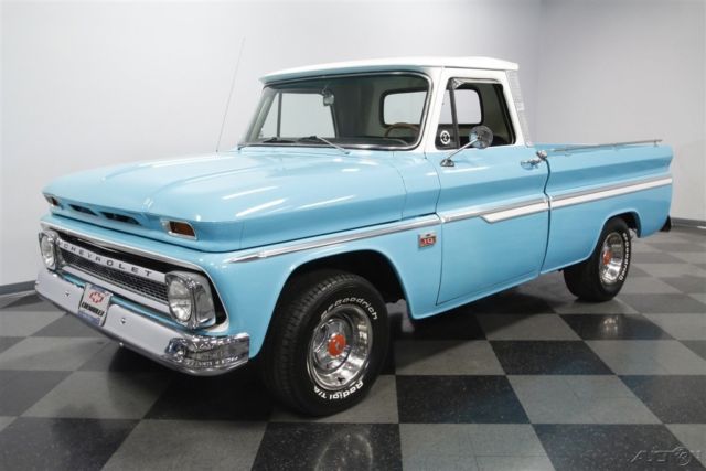 You can't go wrong with a handsome older pickup in traditional colors, but this 1966 Chevrolet C10 Custom Cab is actually a wolf in sheep's clothing. The lovely two-tone paint is low-key, but the upgraded V8 and four-speed adds bark and bite to this shiny Chevy. A clean old pickup in classic colors and wearing a fleetside bed always makes for an appealing package. The two-tone light blue with white accents is just perfect on a vehicle from the mid-60s. The finish shines beautifully, and they kept the wonderful details that make these trucks special. The big chrome bumpers, wide grille, and all the intricate trim â€" including full-length side accents and Custom Cab pillars â€" are terrific correct pieces. Plus, there are nice subtle upgrades like the bed rails, blue-dot taillights, and polished factory wheel covers with Rally-style trim. It gives this pickup as much appeal as a '66 Impala â€" and that sedan doesn't come with a gorgeous real wood truck bed! Inside is a nice mix of vintage and new. The door panels, dash, and bench seat look complete and correct. But now you also have great upgrades for comfortable cruising like the AM/FM/CD stereo and the removable cup holder center arm rest. This classic Chevy pickup even has a sunroof! The vintage dual-spoke steering wheel gives you a terrific view of the factory gauges. As you spot the large tach, auxiliary gauge trio, and floor shifter, this classic pickup also gives your senses the tingle of performance. Under the hood is what makes this pickup the complete cool package. You get the show-off shine of the valve covers and air cleaner, but beneath that is some real power. The 350 cubic-inch V8 has all the right upgrades, including a four-barrel carburetor, K&N air filter, and MSD ignition. Plus, the headers add even more power as they also contribute to the rumble of the glasspack-style. It's a powerful V8 that you get complete control over the speed and the sound thanks to the Muncie four-speed manual. But more than just a pure power pickup, it truly is an easy cruiser thanks to features like power steering, front disc brakes, and the C10's trailing arm rear suspension. A cool exterior, a custom interior, and a growling V8 is why you were attracted to this Chevrolet C10 pickup. But the same great custom features attracted others, too, so you may want to hurry up and call today!
