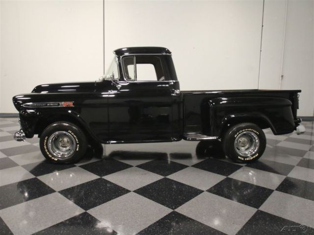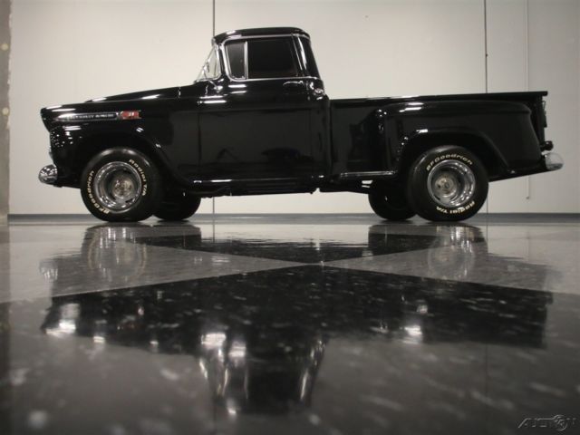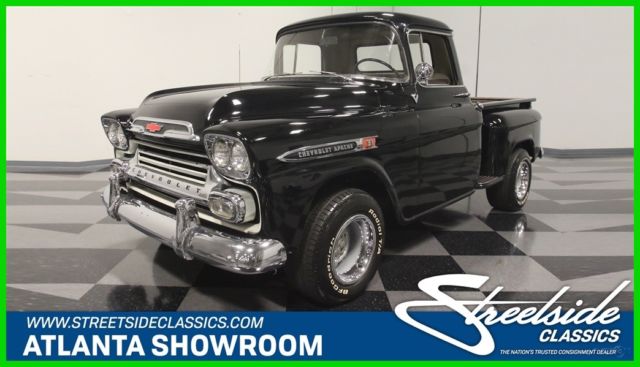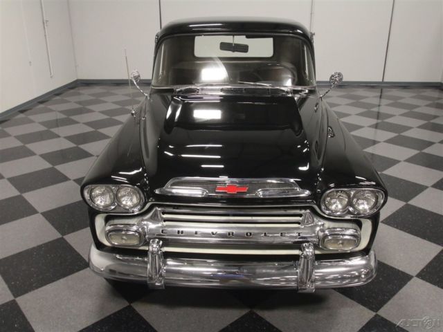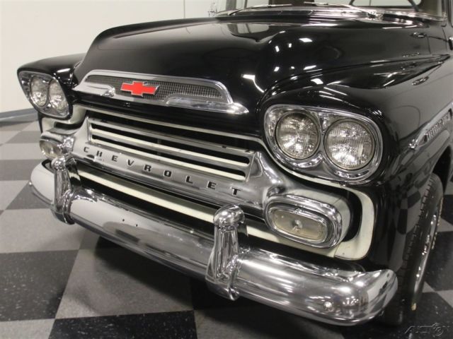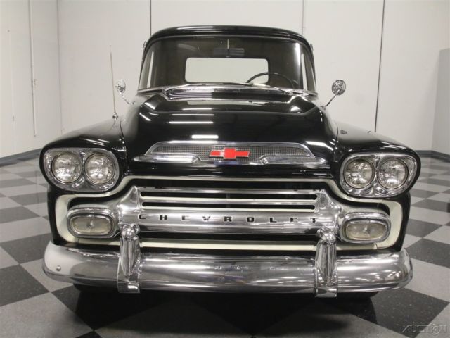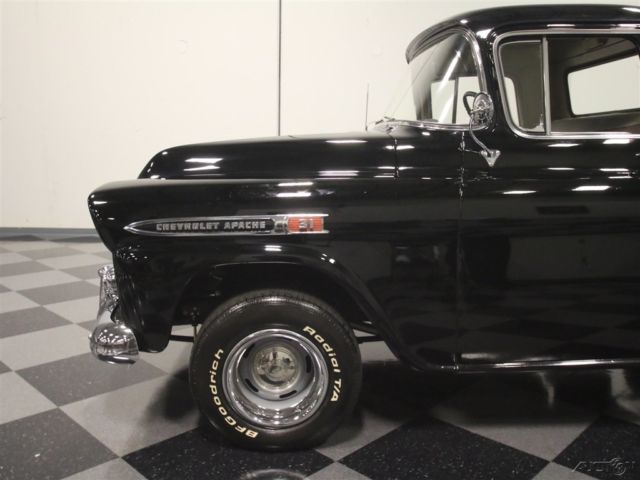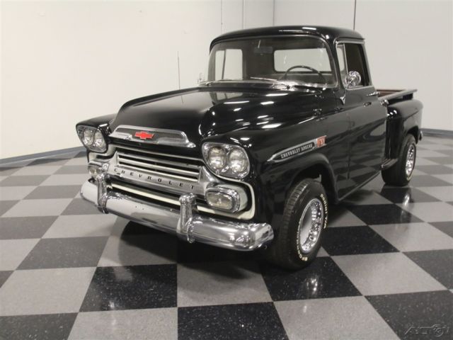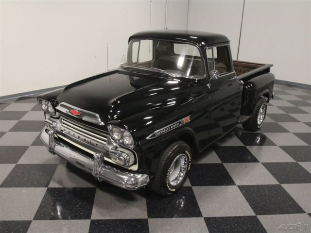 This 1959 Chevrolet Apache is a truck that needs no excuses. It looks great, it packs a fresh 283 cubic inch V8, and it's still practical enough to actually use as a truck. If you want a do-everything hobby vehicle, you could certainly do worse than this black stepside. Today, honest vintage pickup trucks that are still ready, willing and able to go to work are getting harder to find all the time. Fortunately, this one is ready to rock and that's all original steel that has never required major surgery, and the black paint shows it off to great effect. Instead, it has been properly maintained and lightly used for the past 53 years, and presents in solid condition today. The doors open and close solidly, the hood fits well, and the whole truck looks eager to get back to work. In the bed, you'll find a proper-looking bed that's finished in basic black, not polished like a dance floor, so you won't be afraid to use it. There's also a good bit of chrome on the top-of-the-line Apache, including the ornate grille, big bumpers, and those cool emblems on the front fenders, all of which are in good condition overall, although the rear bumper is showing its age. <BR The interior has been very nicely finished, and shows you just how basic these machines were when they were new. Forget luxury, these were little more than tools and nobody in 1958 was buying a pickup truck without needing to haul something. The seat features a new tan cloth cover, there's a correct rubber floor mat on the floor, and the door panels are finished to match the seat. The dash features a single stylish triangular pod for the speedometer, along with four smaller auxiliary gauges that are built right in, and there's an auxiliary gauge under the dash. You'll also note that it has the original "three-on-the-tree" 3-speed manual transmission, something familiar to more than a few of us who learned to drive out in the country. The big steering wheel makes it easy to wheel the truck around and it's surprisingly nimble given its utilitarian roots. The only notable upgrade is a new AM/FM stereo system that has been nicely integrated into the original dashboard. Pop that big hood and you'll be pleasantly surprised to find a 283 cubic inch V8, which was on the menu in 1958. Nicely detailed with Chevrolet Orange paint along with Chevrolet script valve covers and a chrome air cleaner, it looks right at home in the big engine bay. It uses an Edelbrock 4-barrel carburetor to help build power, but the overall look is very much in tune with the period. Underneath, it's exceptionally clean, from the frame to the suspension. A fresh dual exhaust system gives it a little bit of a growl, and there are no signs that this was ever a rusty truck. Manual drum brakes do their job properly and live inside a set of newer Rally wheels with fat 15-inch BFGoodrich T/A radials. Clean, honest trucks like this are getting hard to find, but they're worth the search. Imagine driving it to work on nice days, then hitting Home Depot or the local garden center on the weekends. Just because it's old and cool doesn't mean it can't earn its keep. This Apache is a solid, reliable, well-maintained truck that's ready for another 58 years of work.