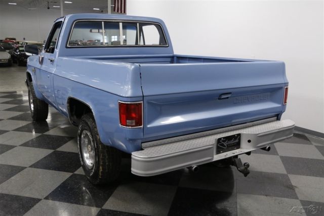When you want a cool classic 4x4 pickup that has investments to look great, and it's still ready for work, it's time to step up to this 1985 Chevrolet K-10 Custom Deluxe. This truck has the charm of originality mixed with the right amount of flair. For example, the factory-correct light blue paint has been re-sprayed, so you get a nice clear coat luster. It also nicely showcases the gentle curves and sharp lines that makes these Chevy trucks so desirable. That darker blue pinstripe really helps highlight how straight the sheet metal is. But more than just a great-looking classic, this one still knows how to get to work. The tall stance and 4x4 hubs on the Rally wheels are an instant sign of a go-anywhere Chevy. And the color-matched liner paint in the bed and full tow hitch are exactly what you want in a practical classic pickup. If you like the way the light blue with darker blue accent looks on the outside, then you'll love the inside. This two-tone blue is an expert mix on the door panels, dash, and freshly re-covered bench seat. We love how the full gauge panel wraps around the driver almost like a sports car. Plus, with the AM/FM/cassette stereo and sliding rear window, this is the perfect pickup to crank up the tunes and let the wind whip through the cab. Under the hood is what's believed to be (per the consignor) the original 305 cubic-inch V8. That's not hard to believe considering the terrific look of authenticity, right down to the correct jack still mounted on the inner fender wall. You can also tell by the presentation that this has received the right maintenance over the years. This feeling continues in the undercarriage phots where you'll be able to spot investments that include new shocks, ball joints, and front universal joints (call for the full list of recent investments.) The four-speed manual transmission has a low first great for great immediate torque. That combines with the 4x4's two-speed transfer case to give you true go-anywhere power. Plus, with the power steering, power brakes, and new tires, this is one is a fine choice for driving on the pavement, too. Nicely coordinated, nicely invested, and all-around nicely presented â€" this is the classic truck that impresses with its value. Call now!