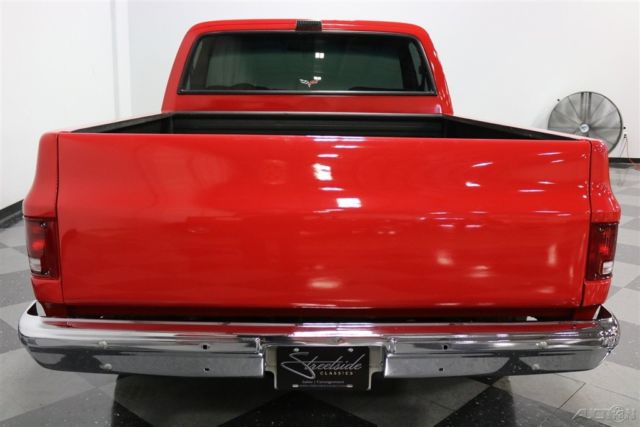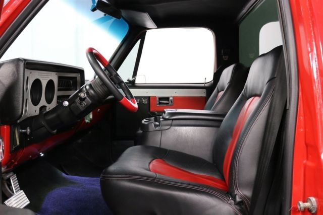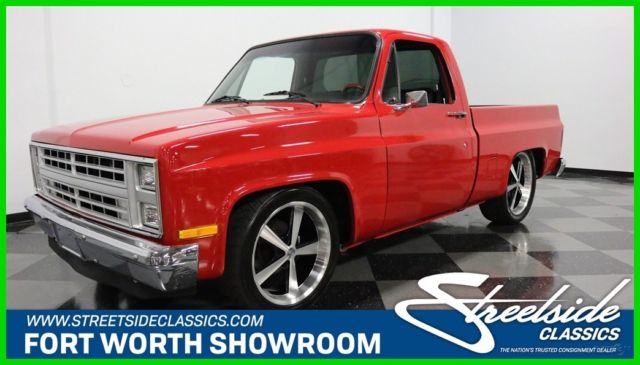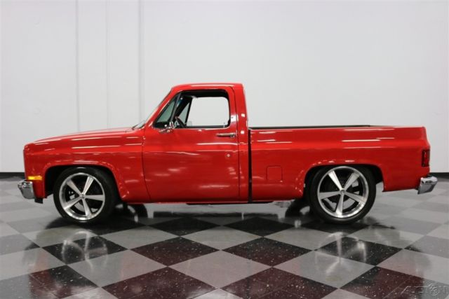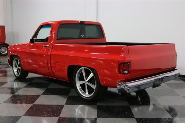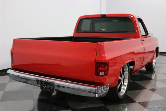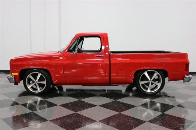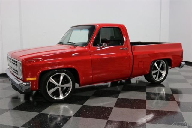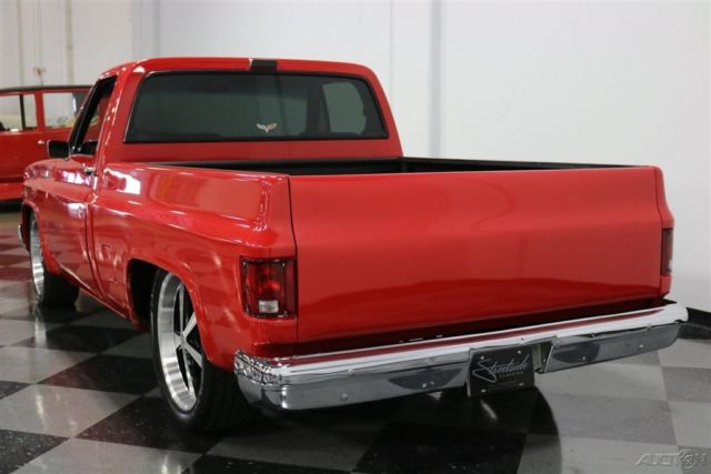 This sharp looking 1984 Chevrolet C10 Restomod didn't go through just your ordinary build - it was reconfigured at the hands of restoration professional Mike McKee from the TV show Street Outlaws and comes complete with an extensive collection of build receipts as backup for the effort that went into it. Along with the high impact look it sports as the result, you'll also find an array of upgraded components to provide the versatility that will allow it to effortlessly go from trusty daily driver to a very capable competitor at car shows. The attention grabbing power of this Chevy truck is obvious right away. It wears a deep red shade that draws you in, with a badgeless look that really lets the paint take center stage. Up front, new headlights look back at you from inside their fresh casings as they straddle an also new front grille that sits precisely level above the bumper. In back, the tailgate handle has been shaved and relocated inside for a great custom look and both the taillights and parking lights have been replaced entirely. The glass is nice and clear on all four sides of the cab and fresh-looking rubber seals surrounding the front and rear windshields. The featured Bell lowering kit provides an aggressive, lowered stance without going to such an extreme as to compromise drivability. A show-stopping, custom two-tone interior sits inside the doors, with a pair of new-looking buckets on either side of a custom center console that carries a subwoofer to team with the Pioneer AM/FM/CD stereo, an array of speakers and an Alpine amp to fill the cabin with sound. Dynamat has been added underneath the carpeting for heat and noise protection. In front of the matching two-tone Grant GT steering wheel sitting on its tilt column is a dash area that's been thoroughly reworked, with a set of white-faced Dakota gauges residing in a billet instrument panel and a new-looking dash pad above. There's plenty of functionality on hand here - the air conditioning system is blowing as cold as you could want, the gauges and control knobs are working properly and new motors have been added to both power windows so they're raising and lowering perfectly. The bed area in back is protected by a black, spray on liner. A collection of top tier components have been assembled to make this C10 an outstanding driver. The 5.3 liter V8 under the hood has been armed with aluminum heads, a Texas Speed cam and cold air induction, while a Holley fuel injection system sits on top to provide dependable cold weather starting and adjustability. The engine has logged only 2500 miles and is in top form, running smoothly and strong while sounding great as it sings into its Hooker headers leading out to a Flowmaster dual exhaust. It's paired with a 4-speed automatic 4L60E transmission and a 10 bolt 3.73 posi rear end. There's no shortage of eye candy on display inside the engine compartment -a custom chrome air conditioning compressor and water pump have been added to the mix, while a custom Ron Davis aluminum radiator sits up front, accompanied by twin fans to keep engine temperatures in check. Featured power steering makes navigating this classic truck a low-effort undertaking, while 4-wheel power brakes - with discs up front-provide fade free stopping ability as it cruises on its awesome looking black and polished aluminum American Racing wheels wearing Nitto tires. While there's no shortage of customized classic trucks, a skillfully and professionally assembled example like this 1984 Chevrolet C10 Restomod will always stand out from the crowd. Call today!