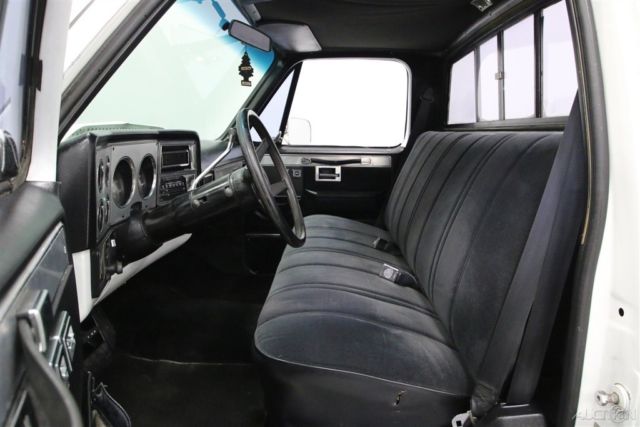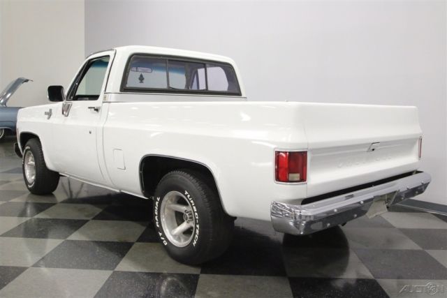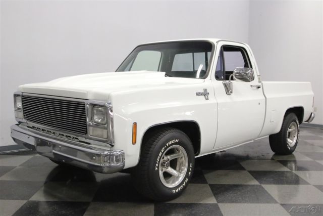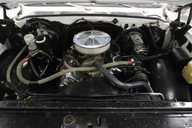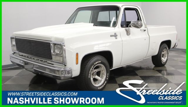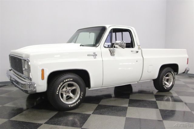 Neat and clean in White with splashes of chrome, this is a great looking Silverado. The mid-70s pickups are more popular than ever these days. They have modern classic styling, drive well, and are capable of getting the job done without a pile of computers complicating things. Check this one out. The crisp clean body lines of this pickup are a great starting point for the look of this truck. From the side you see a crease running down the mid-line from front to rear. That is paralleled by the top line of the fender that flows cleanly along the top of the door and then the bed. It gives the truck a really solid look. There is a Silverado badge on the fender and a splash of chrome trim around the wheel wells. Up front a chrome billet grill of horizontal lines keeps the look clean and is underlined by a simple bumper. The cowl induction hood hints at the beast within, but does so without screaming it out with a bunch of stripes or lettering. Things are kept equally simple and clean out back in white and chrome and the bed has been coated with spray in bed liner. Complementing the look are 5-lug Eagle polished alloy wheels. Open the door and you will find a stock interior that is a comfortable place to put some miles in or get some work done. The door panel has controls at your fingertips for the power windows and locks along with a comfortable armrest for cruising down the road. A 4-spoke steering wheel mounted on a tilt column with the shifter for the automatic transmission sits in front of a stock dashboard. The tach and speedo are front and center with the fuel, temp, oil and voltage gauges off to the left. Ventilation controls, including those for the updated R134 air conditioning to keep you cool are in the center. A Kenwood stereo is there for your listening pleasure and there is a sliding back window. The cloth bench seat is comfortable with plenty of room for three across with the shifter being mounted on the column. Pop the hood with the big cowl induction bump on it and you will find a very healthy, 454 cubic inch, big block. There is a chrome air cleaner topping an Edelbrock 4-barrel carburetor and Edelbrock Performer 2.0 intake manifold. Those 454 valve covers nestled under the alternator and A/C compressor shine through because they are polished up chrome, and because big block valve covers are huge. There is a new brake booster and master cylinder along with a new battery and newer belts and hoses. Long tube headers get the exhaust heading back through glass pack style muffler that give the truck a healthy sound and the power flows back through a 3-speed automatic transmission to the rear wheels. Front disc brakes provide good stopping ability and the rubber meets the road through 255/70R15 tires all around mounted on those great looking Ridler wheels. Neat, clean, comfortable, and more than capable with a healthy 454 under the hood. Come on down and check out this Silverado.