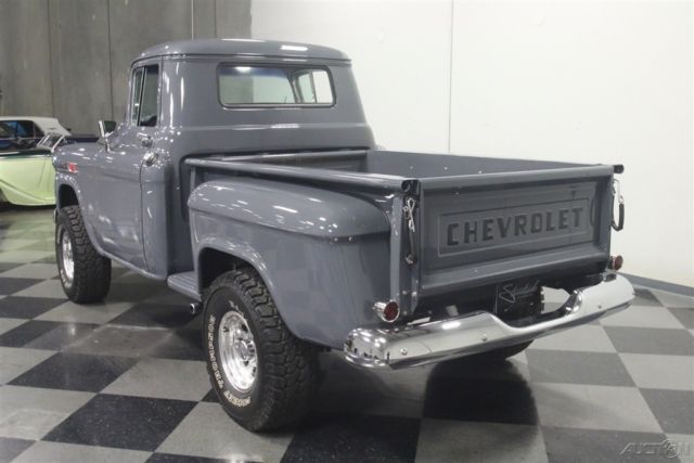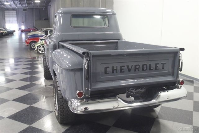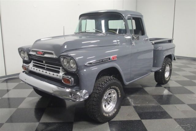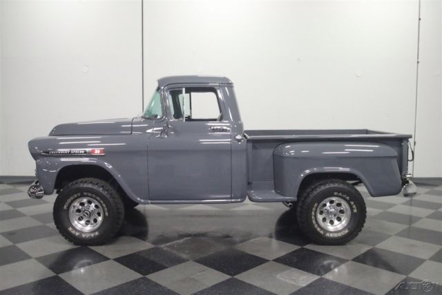 Cool hybrids like this 1959 Chevrolet Apache 4x4 make for ideal hobby vehicles. With a late-model chassis underneath and old-school looks on top, it does everything you want an old truck to do but with a lot fewer hassles. The fact that it looks like a million bucks and runs like the factory built it this way are merely icing on the cake. If you have a stepside Apache, you'll probably be shocked to learn that it's such a neat fit on an '80s K10 chassis, but here's the proof. At a glance, it looks like the factory built it, and that's purely intentional. They kept all the bodywork stock to give it that 1950s look, complete with the period-perfect paint job in battleship gray. The dramatically styled Apache pickups were some of the most handsome on the road back then and if you want attention, this truck will definitely deliver. The bodywork is nicely done, but not so perfect as to erase the fact that this is still a truck that's willing to work. Gaps are the way the factory would have done things and the paint has a shine that's better than anything available in 1959. The stepside bed gives it a muscular look and the especially with those oversized tires living in the fenders. Add in some brightly re-chromed bumpers, a factory grille, and a bed that's beautifully refinished with oak planks, and you get a truck that does everything extremely well. The interior is still basic, but the upgrades are visible throughout. The two-tone bench seat has pleated inserts to make it more comfortable on long hauls they worked hard to integrate the original controls with the modern chassis living underneath. The fat wood-rimmed wheel is easy to spot, but on the other hand, the original gauges remain fully functional monitoring the later engine. The original AM radio is gone, replaced by a digital AM/FM unit, and the 8-ball shift knob is linked to a 4-speed manual gearbox with a 2-speed transfer case behind it. Gray rubber mats help with the vintage pickup vibe and certainly sticks with the low-maintenance vibe. But that's the look and it works really well. The late-model chassis is from an '80s K10 pickup, and that included a great-running 350 cubic inch V8. Not dramatically modified, it sports a Holley 4-barrel carburetor on an aluminum intake manifold, but they were careful to keep it closer to its production roots rather than choosing a lot of modifications. Moroso valve covers and Chevy Orange paint brighten things up in a good way, and you'll note there's a big aluminum radiator up front to keep things nice and cool. The late-model swap also includes power steering and power front disc brakes, both welcome safety upgrades. Newer shocks along with dual steering stabilizers tame the ride quality to make this truck a pleasure to drive and the polished aluminum wheels and big 33x12.50-15 Mickey Thompson off-road radials look exactly right when on a lifted truck as beautiful as this one. A cool old pickup with a bit of a modern flair makes for a very usable package. Drive it, show it, take it to work, there's nothing this truck doesn't do well. Apaches are hard to find these days, and rarely do we see them restored to such a high level, let alone on a 4x4 frame. Call today!
