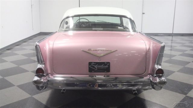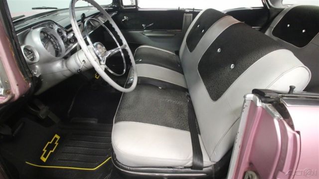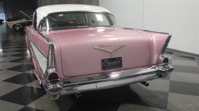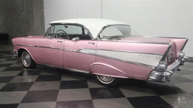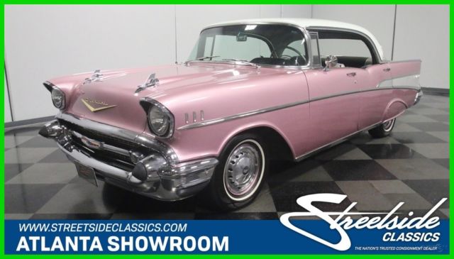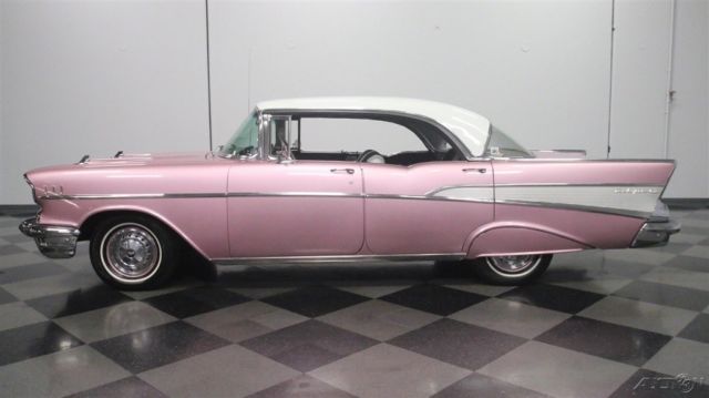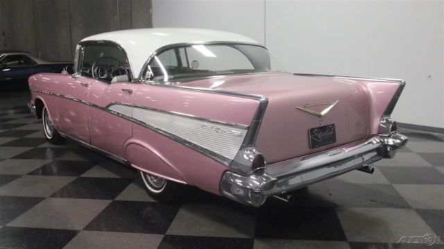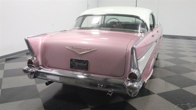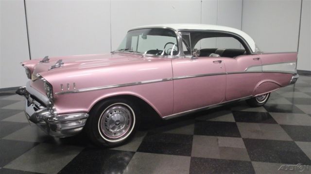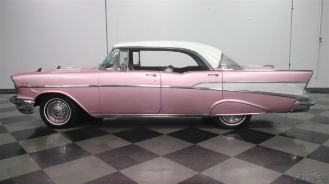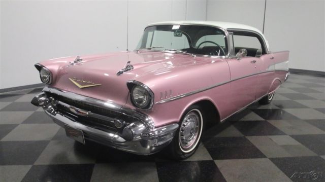 A little original, a little restored, and a lot of personality define this 1957 Chevrolet Bel Air hardtop sedan. It offers fantastic features like that Dusk Rose paint, which is its original color, plus a great-running 283 cubic inch V8, power steering, and plenty of recent work. It's hard to say where the line between original and restored parts is, because this car has an all-of-a-piece look that's quite appealing. No, it's not quite perfect, but the repaint looks great and it has that great look that comes from years of care. The paint accurately represents the original color and while there are signs of use, you can consider all that stuff as badges of honor. The 4-door hardtop styling is almost indistinguishable from the 2-doors unless you count door handles, thanks to some clever styling by the guys at GM and you simply can't go wrong with a '57 of any kind. This is the car's original color combination and it works well on the '50s cruiser, especially with fender skirts and all that chrome, most of which is in very good condition. You're either man enough to handle this Bel Air or you're not, but if you're not, you're really missing out. The interior is nicely restored and very correct, with two-tone gray and black upholstery with funky brocade inserts that are quite correct for 1957. The carpets were replaced at the same time, as well as the door panels, so it all looks quite nice, particularly in back where it has hardly any sign of use. Original gauges look decent and there's a factory AM radio in the center of the dash and miraculously enough, it works like it should. The steering wheel shows some signs of age but no major cracking or crumbling and the bright trim that spans the dash is in excellent shape. Heavy-duty rubber floor mats protect the floors and there's a handy set of cup holders on the transmission tunnel, suggesting that this one was built to cruise. A nicely finished trunk includes nicely tailored black carpets instead of the original rubber mat, plus a full-sized spare with a matching cover and a proper jack assembly. The engine is a 283 cubic inch V8 that looks exactly right under the hood of this Bel Air. It's properly detailed with Chevy Orange paint, a heavy-duty air cleaner, and stamped steel valve covers with Chevrolet script on their faces, a refreshing change from all the over-chromed cars you see a shows. The big air cleaner dominates the top of the engine bay, but you'll also note a correct generator/power steering pump assembly, another desirable option, as well as a windshield washer system. There are plenty of signs of care and maintenance over the years, and it does run and drive well thanks and sounds great burgling through a recent dual exhaust system with glasspack-style mufflers. Backed by a 2-speed PowerGlide automatic transmission, it's fun to drive and eminently practical for the hobbyist with a family. The chassis is fairly original but it's extremely clean with just a light dusting of undercoating to protect the metal. Factory steel wheels with hubcaps are the right choice and carry recent 215/75/14 whitewall radials. Icons don't get much more affordable than this and with several desirable options and a cool color combination, it's a very worthy car for the guy who wants to take it to the next level. Call today!