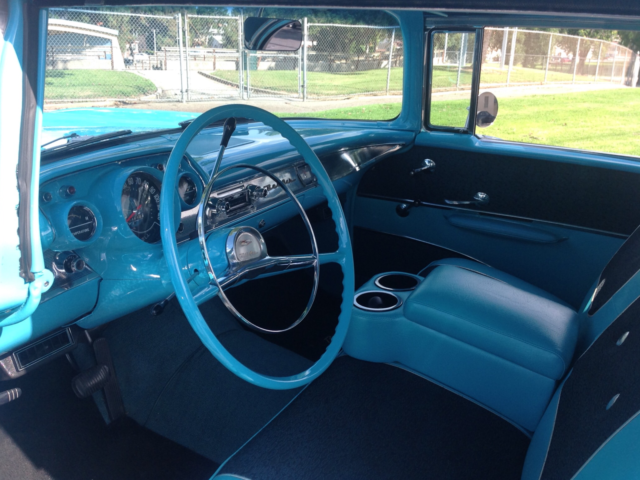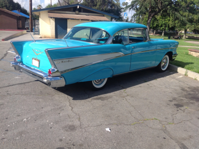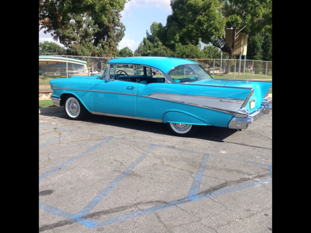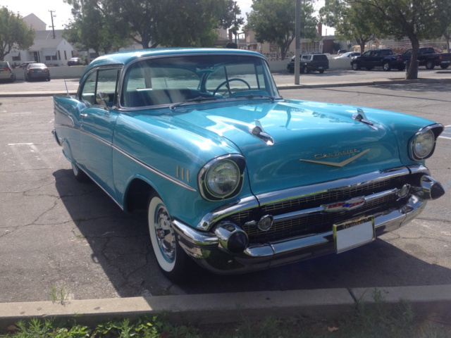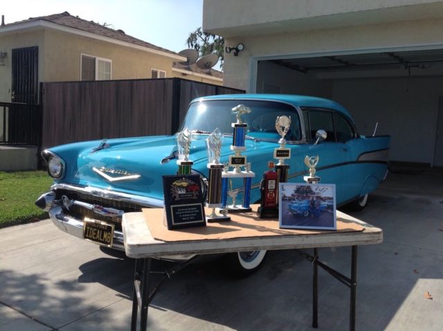 Very clean 1957 Chevy Bel Air two door hard top. This is a show car with many trophies to prove it. The engine is a 283cu with a 700 R 4 automatic transmission, it has a polished aluminum radiator with a electric radiator fan. You can stay cool because it has an AC that works very good and a nice stereo system. The factory color is turquoise, it has a metal tab that has this information on it, it has a beautiful paint job inside and out. The interior is also turquoise and dark blue. The outside and inside have a perfect match. This car turns heads wherever I go. The engine compartment and the trunk are just as clean as the outside of the car. I only drive this car on weekends and to car shows, this car has always been garaged, so if your looking for a very nice clean show car that runs and looks great than check this car out, you won't be disappointed. I will send more pictures upon request. For more information, please contact me.NO TRADES AND NO LOW BALL OFFERS.I am asking $45,000 or best offer..Thank you.