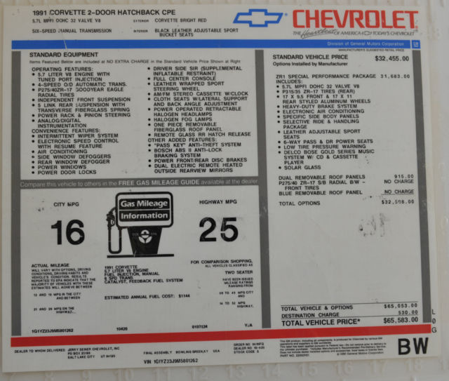 This Corvette is in mint condition, never wrecked. I bought the car with 11,000 miles, and have never spun the tires since I bought it.Pros: I have replaced the fuel injectors, added SS Corsa exhaust, replaced the starter, alternator, battery, and plug wires. The tires are Goodyear Eagle F1's, almost new. I have two tops.The paper work includes the original window sticker, build sheet, the video, key chain and brochure.Cons: The radio does not work, but can be fixed by repair shop in central Florida. There is a slight repair that needs to be fixed, on edge of driver seat door, approximately 1/2" long.
