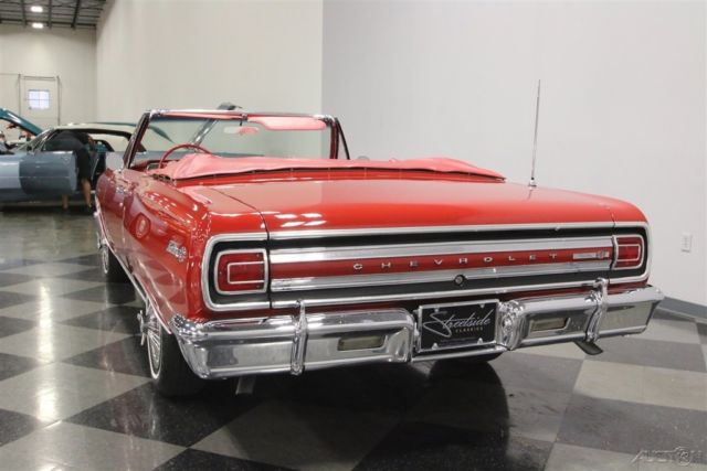 The Malibu SS was offered for only 2 years before the SS became a Chevelle only option. Compound that special status with it being an SS Convertible, with a believed to be numbers matching 327 engine, and what we present to you here is an opportunity to buy one very special car. When you are starting with a car this special by nature, you want to make sure to get the details right during the restoration. They did. The car was restored to be completely stock in appearance as it would have looked on the showroom floor in 1965. Of-course that starts with proper preparation. You can see that the body panels were worked and adjusted so that they were straight and the gaps between them consistent before a drop of that Red paint went on them. Then new chrome and trim was sourced for a super clean look. Up front, the blacked-out grill is the correct SS piece with some of that fresh trim surrounding the quad headlights with a bright shiny bumper underlining it. There is a 327 emblem on the front fender and Malibu SS on the rear with new wheel well and rocker chrome looking sharp too. The back of the car looks great with Chevrolet in script trimmed out with black and brightwork and another shiny new bumper. The interior worked the same way. Keep it stock. Stock just happens to be an absolutely gorgeous two-tone Red interior. The door panel has a red top and dark red bottom with horizontal pleats and chrome piping. The seats look awesome with pleated dark red center sections surrounded by smooth red panels. The upholstery work is outstanding and the craftsmanship carries through on the back seat and roof boot too. A red steering wheel with a semicircular chrome horn ring sits in front of an aluminum dash panel that is tucked between a padded red upper and painted red lower. The panel and gauges are meticulously polished up and detailed out with the tach in the center, the speedo on the left and the engine gauges on the right. A T-handle shifter for the automatic transmission sits in the center console and Malibu SS appears in script on the glove box. Red carpets are of course perfect and protected by red vinyl floor mats. The whole interior is fresh, clean and just like new. Under the hood you will find that precious, original, 327. It has also been restored to all its showroom original glory and is nestled down in an engine bay that received as much attention to detail as the rest of the car. There is even an original GM washer bottle mounted in its proper bracket on the inner fender well. A black snorkel air filter housing with a 327 Turbo-Fire decal sits on top of a four-barrel carburetor. The engine iron is painted the correct color of Chevrolet Orange as are the valve covers which also have decals proudly announcing it as the 327 Turbo-Fire 300 Horsepower motor. All that power is sent back through a 2-speed automatic transmission to the rear axle which rides on trailing arms and coil springs. Power steering works through control arms with coil springs and a sway bar up front and power brakes provide good stopping power. The car sits 205/75R14 white wall tires all around which are mounted on steel wheels with center spin wire wheel covers. An awesome car because it is a beautiful, classic, Red convertible V8. Very special because it is a rare, numbers matching car that has been restored to all its stock, original glory. Come on down and check it out.
