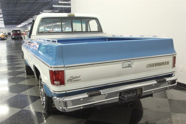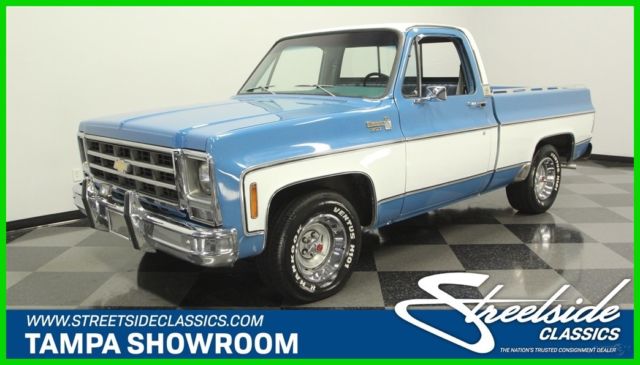 It's time to get a vintage truck that knows how to work and play just as hard as you do. This 1979 Chevrolet Silverado has a cool two-tone appearance, nice investments, it's original factory engine, and an A/C interior â€" all for an irresistible price. Two-tone and plenty of chrome trim perfectly represents this top-of-the-line Silverado model. And the premium appearance is capped off by the Rally wheels â€" the feature you look for on the classic Chevy muscle cars was also a factory option for premium pickups! This truck is nothing but straight crease lines and horizontal brightwork, so it's great to see this workhorse has been respected all its life. It was even treated to a modern clearcoat respray once in its lifetime. And while this classic knows how to look nice, it's also still a useful truck. That's why you have extra driving lights, tie-down rails on the side of the bed, and a proper trailer hitch in the rear. Inside is more of the loaded Silverado attitude. This truck came with all the best features like power windows, power locks, and an AM/FM/cassette stereo â€" all still working correctly today. Plus, the upgrades are subtle. For example, the bench seat is believed to be newer, but it's finished in the classic button-top presentation to keep looking correct. And the factory air conditioning has been converted to R134a for easy serving for years to come. As you slip behind the factory steering wheel, slide open the rear window, and head on down the road, this one gives you all the best old-school truck feelings. Under the hood is Chevy's trusty and powerful 350 cubic-inch V8. This is the original engine. It inhales deeply with a four-barrel carburetor and Edelbrock intake. And it exhales nicely with the dual exhaust. There's even an aluminum radiator to keep this pickup running cool. Plus, the three-speed automatic transmission, power steering, and front disc brakes combine to make for a terrific total cruising package. This sale comes with a ton of paperwork, including the original order form, dealer invoice, canceled checks, and title docs. So this the classic pickup that gives you all the right features to enjoy, and exceptionally affordable price is just the bonus. Don't miss this deal, call today!