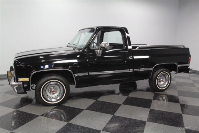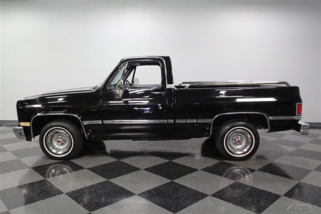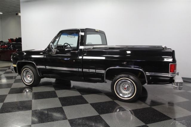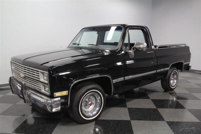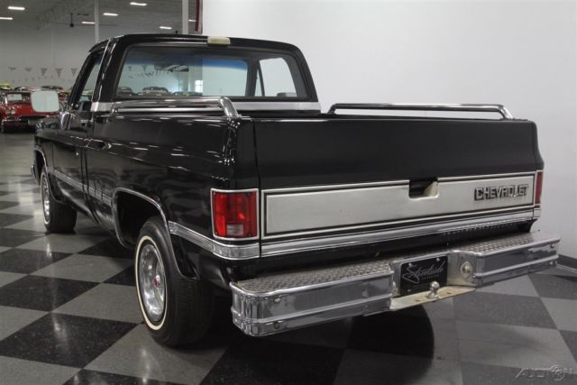 Great upgrades, V8 power, an overdrive transmission, and a value price â€" this 1984 Chevrolet C10 Silverado does a great job of turning heads and making people you paid far more. Black is beautiful, especially when you're looking at a more recent application with a terrific gloss coming off the clearcoat. As the light reflects off this deep luster, it also highlights all the well-creased sheetmetal that made you love this generation Chevy truck. These beefy lines are nicely balanced out by the premium Silverado package with bright chrome bumpers, and a trim line that runs down both side and wraps around the rear. Plus, this has plenty of nice upgrades like the bright bed rails, trailer hitch in the bumper, and sporty spinners in the Rally wheels. Inside this one reminds you the Silverado was the top trim with its premium presentation. The seat cover is newer, and it's made of a comfortable velour cloth. The black and silver on here is part of a coordinating package with the door panels, carpeting, headliner, steering wheel, and dash. This is set up to be a driver's pickup, with all the essential controls surrounding you. Plus, you have great features like power windows, power locks, a tilt steering column, and an AM/FM/cassette stereo. Under the hood this truck has been upgraded to Chevy's trusty 350 cubic-inch small block. Just like the exterior, the engine bay looks great with plenty of glossy black and nice polished accents. The V8 inhales deeply with an Edelbrock four-barrel carburetor, and it exhales with authority as ceramic-coated headers add power while also contributing to the rumble of the dual exhaust. Out on the road, features like power steering and front disc brakes make this a great cruiser. There's even a four-speed automatic transmission. This long-haul friendless gets even better with the dual fuel tanks. Complete with the original warranty card, you can see the value in this truck goes well beyond the affordable price. So don't miss your opportunity at a standout Silverado. Call now!