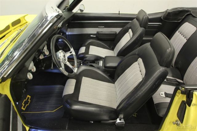 This 1969 Chevrolet Camaro RS restomod is what many of you Chevy fans have been waiting for. There are over $110,000 in restoration receipts to create a convertible with a bold yellow exterior, custom A/C interior, overdrive transmission, and performance-built ZZ4 350 small block that's been supercharged (yes, supercharged!) It's everything you love in one turn-key package. This droptop has been given a serious investment to get all the best features. It starts off with the paint. Daytona Yellow was only offered on the first-gen in '69, and this rare factory-correct color was given a $7,000 professional respray to give it the kind of gloss and shine the factory never could. That is just the tip of a total quality restoration. After all, if you're going invest big in paint, then you're also going to make sure the body looks absolutely terrific, too. And as you look over the whole car, you can tell it was a thoughtful and coordinated restoration. The blacked-out grille, black chrome Boss wheels, taut black folding roof, and subtle custom pinstripe fade are a great contrast to the yellow â€" almost giving it a custom two-tone presentation. The hidden headlights of the RS package made these the most menacing car of the '60s. And if that didn't intimidate everyone already, the cowl induction hood and D80 rear spoiler will. Plus, there's even thoughtful upgrades like LED fog lights and taillights. So it creates a total package unlike anything else out on the road. Since a droptop is meant to be open to the world, the same attractive black against the yellow attitude is carried over inside. People will instantly recognize the houndstooth inserts as a premium classic Camaro feature, but it's also instantly apparent that this is a full custom setup. You get modern TMI buckets with the kind of bolstering that make them all-day comfortable. There are other great upgrades like power locks, LED interior lighting, center console with custom armrest, tilt wheel, and a powerful AM/FM/CD stereo with modern connections for USB and Bluetooth. But the features you'll love the best are the power windows and power convertible top. It allows you to go from enclosed comfort to a wind-in-your-hair experience without ever leaving the driver's seat. And with ice-cold R134a air conditioning, you can do this long into the summer season. There's only about 4,700 miles on this car since it completed restoration, and some pieces like the custom houndstooth door panels were upgraded only months ago. So you know this has been given the right investments and constant attention to be a truly award-worthy setup. And as you slip behind the sports steering wheel, and look at the full AutoMeter Pro-Comp gauge upgrade in the carbon fiber panel, you know that this is far more than just a comfortable classic. Grab your sunglasses before popping the hood, because they spent a small fortune on just the polished component alone. And that won't even be your favorite part. That's because it's a 350 cubic-inch ZZ4 crate motor from Chevrolet Performance. This juggernaut has been further upgraded with Edelbrock aluminum heads, LT4 hydraulic camshaft, roller rockers, and a large Quick Fuel 750 CFM double-pumper four-barrel carburetor. While that would be more than enough performance for some, this one takes it to the ultimate level with a Weiand 144 Pro-Street supercharger on top. This total package is estimated at 530+ horsepower, and the combo of the unique supercharger howl and the growl of the header-fed dual exhaust lets the world know this is a seriously powerful Camaro. Because this is a thoughtful build it has the right supporting components, like an MSD Pro ignition system, trans cooler, and a large aluminum radiator w/electric fans. The mighty V8 feeds a pro-built 700R4 four-speed automatic transmission with 2500 stall. So it's built to handle as much as 750hp, but it also allows you to cruise in overdrive comfort. Plus, with a fully upgraded suspension, power steering, and Wilwood drilled & slotted four-wheel disc brakes, this custom build offers the best in powerful driving and everyday usability. There's so much more that went into this amazing restomod, but we'd run out of space listing it all. So give us a call and we'll be happy to go over all the details â€" including the restoration photos, maintenance records, and thousands $$$$$$ in build receipts. You know this is the ultimate Camaro and a one-of-a-kind opportunity. Call today!!!